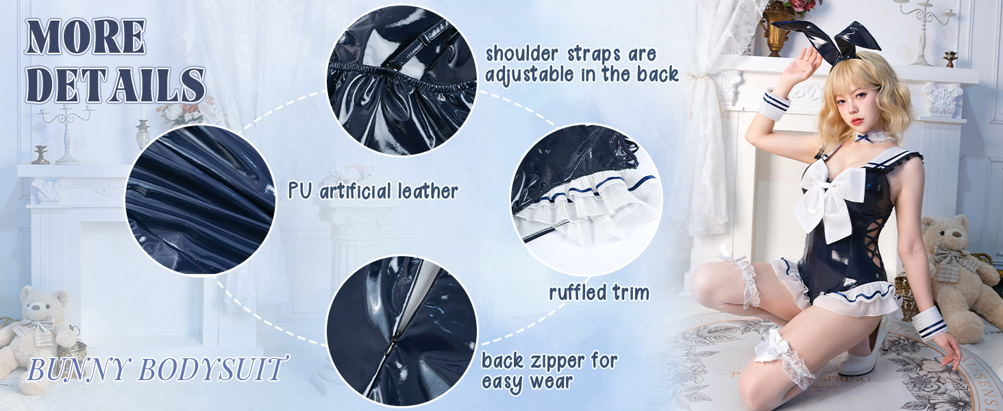 • بدلة أرنب بحار فريدة من نوعها: تميز في زي الأرنب الأزرق الداكن هذا، المستوحى من موضوع البحار. تتميز هذه البدلة بتصميم أرنب بخطوط بحرية على الأساور والكشكشة والأكتاف، وتجمع بين السحر المرح والتصميم الجريء والملفت للنظر. مثالي لحفلات الهالوين أو المناسبات التنكرية أو التجمعات ذات الطابع الخاص، يضمن زي الأرنب النسائي هذا أنك ستكون مركز الاهتمام.