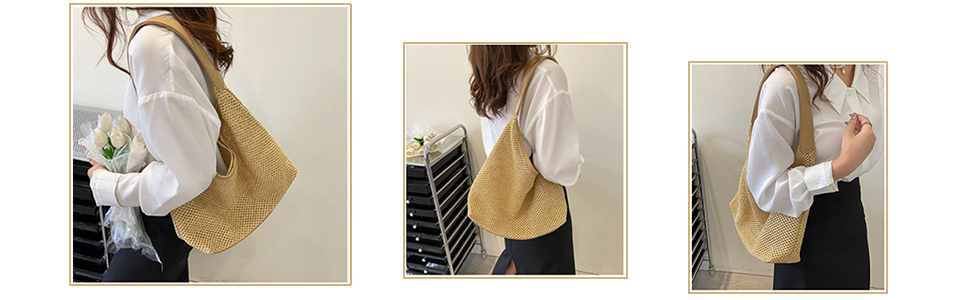 النمط الكلاسيكي: حقائب الشاطئ المنسوجة للنساء، مع صناعة متقنة وتصميم قديم وبسيط، ستجعلك أنيقة وعصرية. ويمكن استخدامها أيضًا كحقيبة كتف أو حقيبة يد أو حقائب كبيرة للشاطئ أو الحفلات أو التسوق أو التخييم أو المواعدة أو غير رسمية يوميًا.