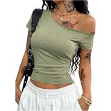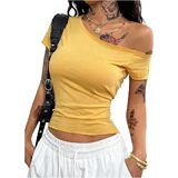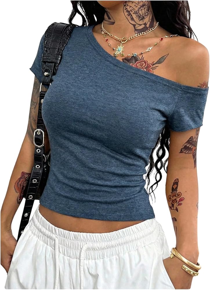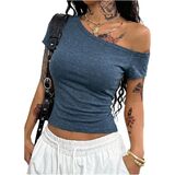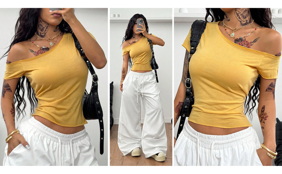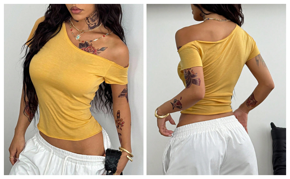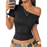 - المزايا: تي شيرت بدون أكتاف للنساء، رقبة غير متماثلة، أكمام قصيرة، قمصان نسائية، مقاس نحيف، عصري
