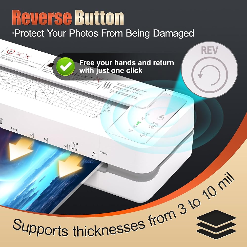 • 【𝐑𝐄𝐕 𝐒𝐦𝐚𝐫𝐭 𝐉𝐚𝐦-𝐏𝐫𝐞𝐯𝐞𝐧𝐭𝐢𝐨𝐧 & 𝐄𝐚𝐬𝐲 𝐑𝐞𝐯𝐞𝐫𝐬𝐞 𝐅𝐮𝐧𝐜𝐭𝐢𝐨𝐧】قل وداعًا لانحشار الورق المحبط. بفضل نظام REV الذكي الموجود في آلة التغليف الحراري هذه، تعمل ضغطة زر بسيطة على عكس الأسطوانات تلقائيًا لإخراج أي مستند تم تلقيمه بشكل غير صحيح. تحمي هذه الميزة الذكية صورك الثمينة وأعمالك الفنية والمستندات المهمة من التجاعيد والتمزقات، مما يضمن عملية تصفيح سلسة في كل مرة تستخدم فيها جهاز التغليف.