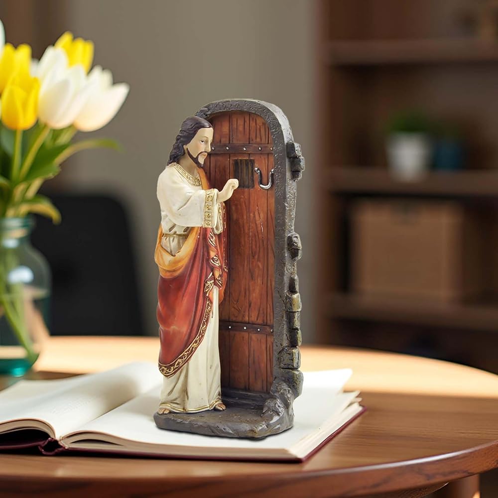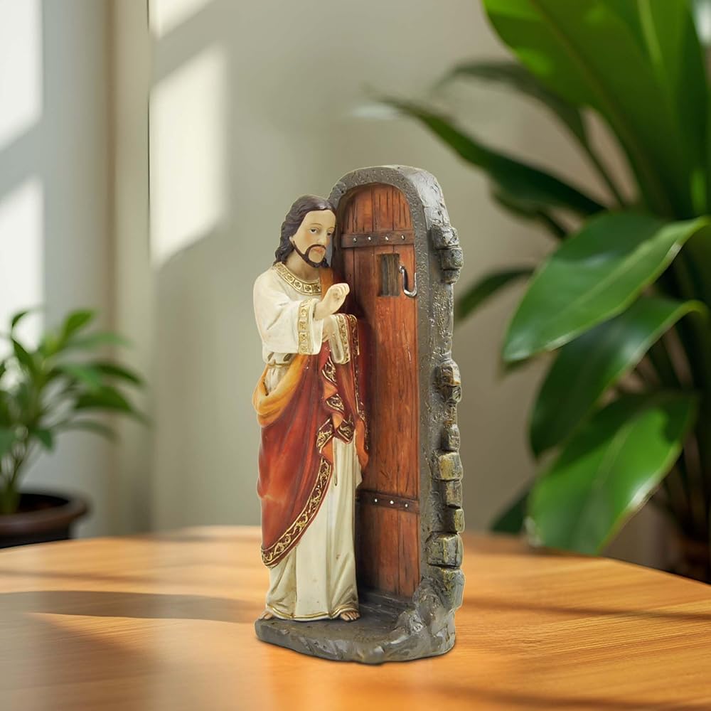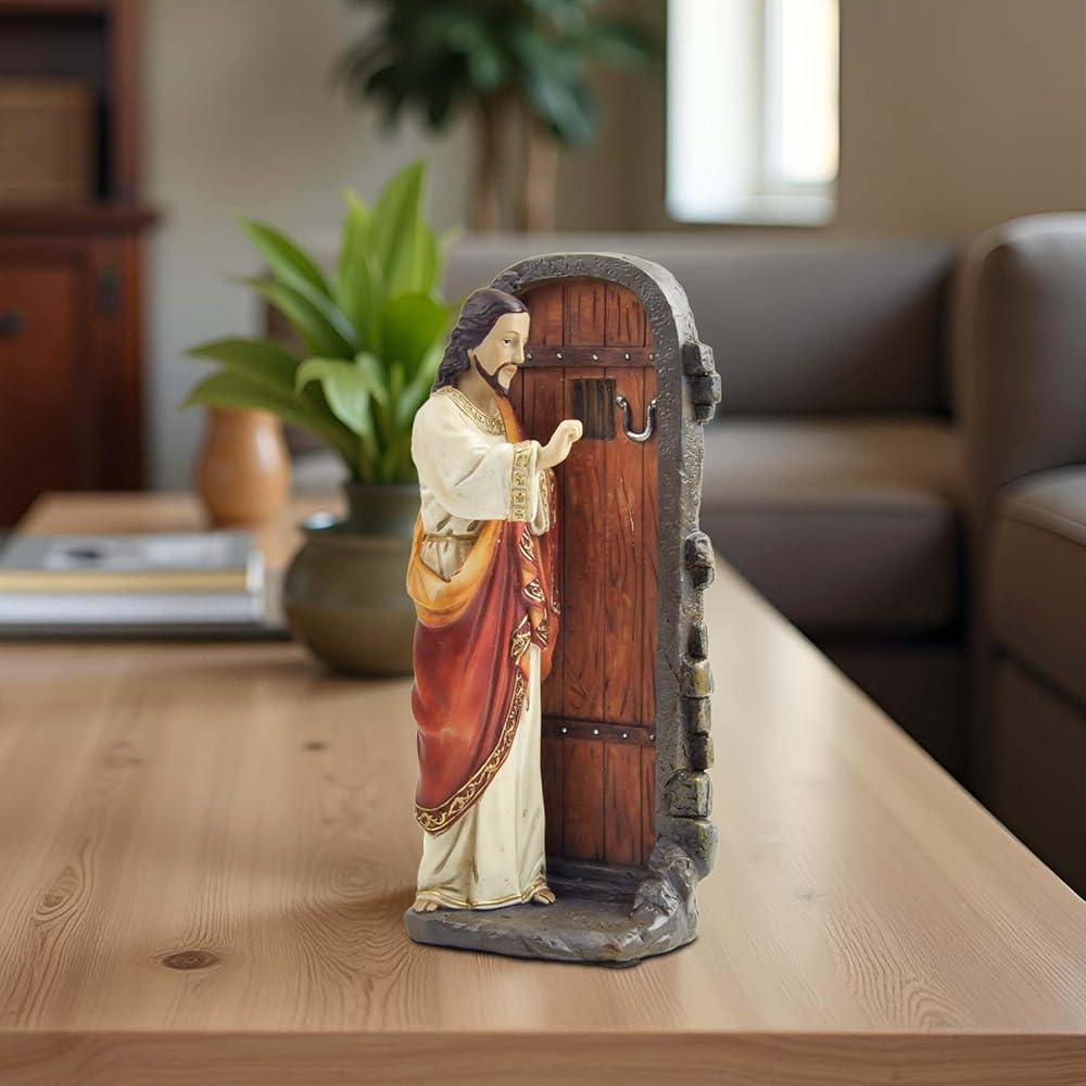 Standing at 5.12 inches tall, this hand-painted resin figurine captures Jesus in a humble and inviting posture, knocking gently on a closed door—symbolizing His presence and desire for fellowship with each of us.