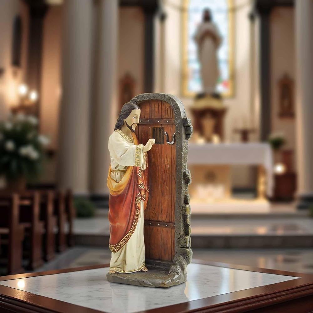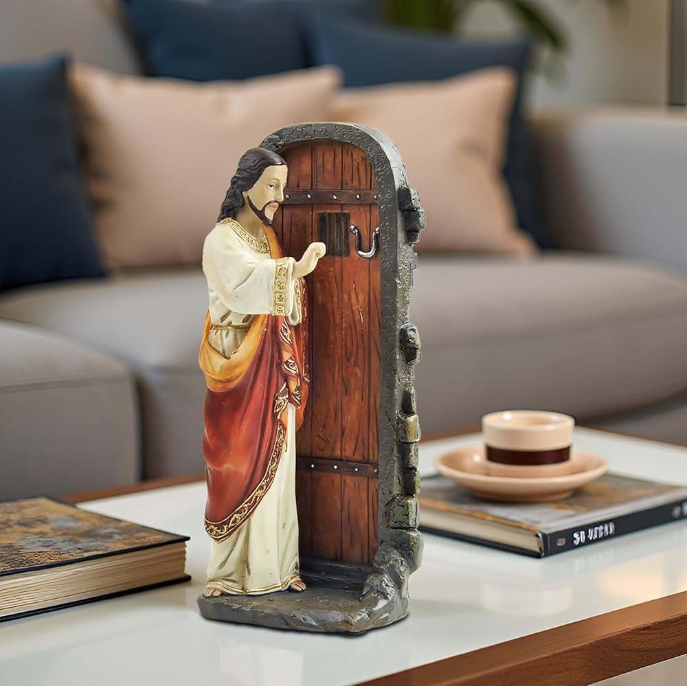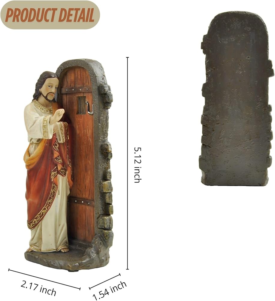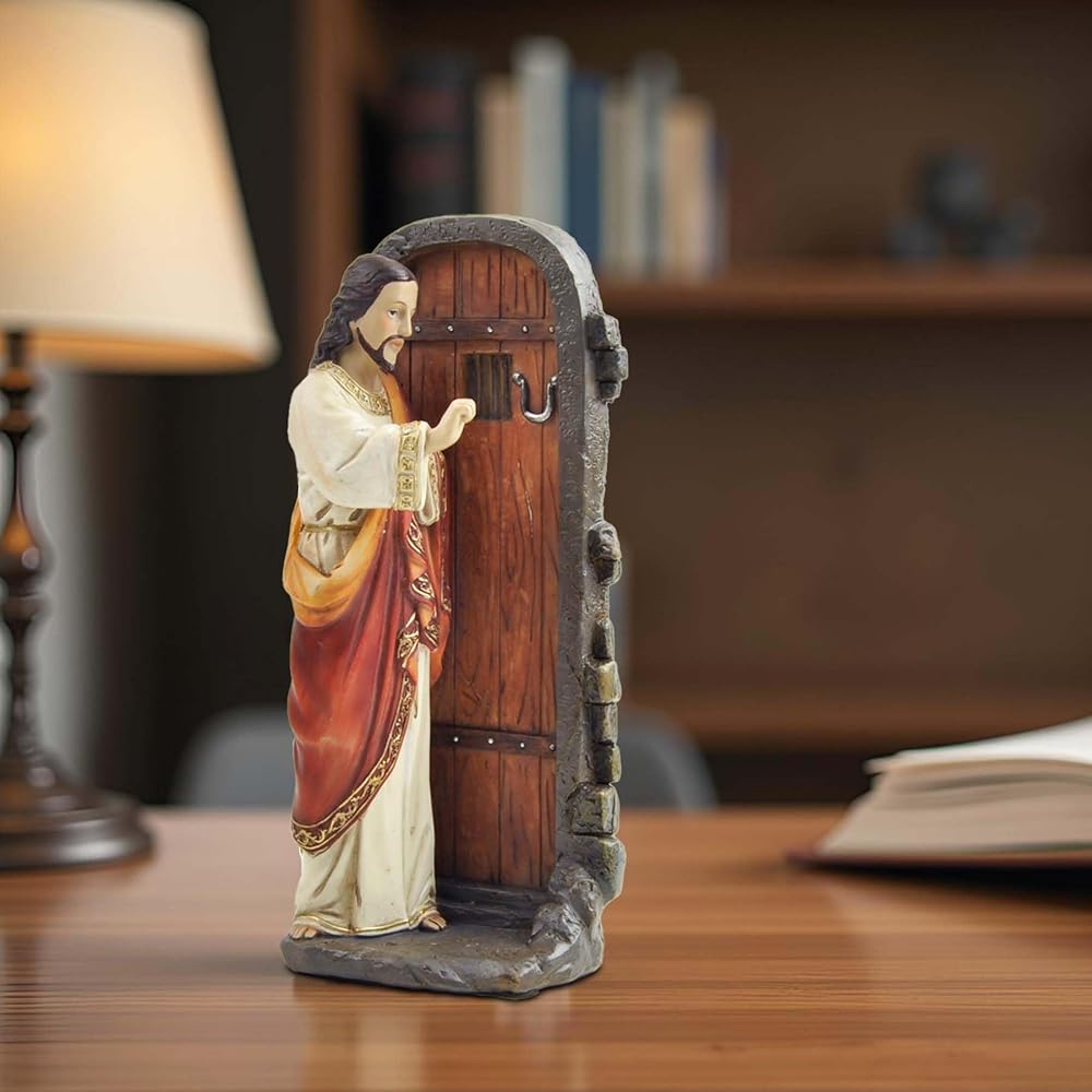 Standing at 5.12 inches tall, this hand-painted resin figurine captures Jesus in a humble and inviting posture, knocking gently on a closed door—symbolizing His presence and desire for fellowship with each of us.