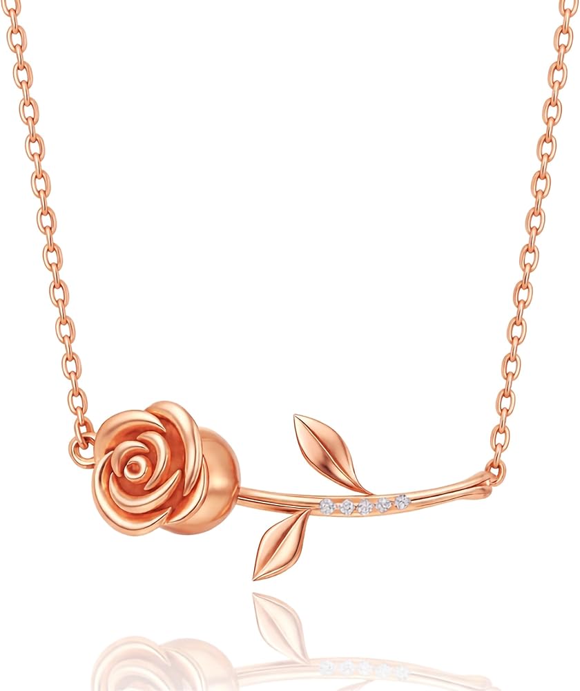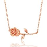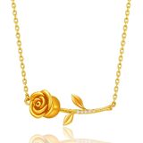 Celebrate love and femininity with this elegant gold rose flower necklace, a timeless symbol of romance and beauty. The sculpted rose pendant features smooth, flowing petals paired with sparkling cubic zirconia accents along the stem, creating a refined yet eye-catching look. Designed with a high-polish gold finish, this necklace offers a luxurious appearance while remaining lightweight and comfortable for everyday wear. Whether styled for work, a date night, or a special celebration, it adds a graceful touch to any outfit. Beautifully symbolic and effortlessly elegant, this rose necklace makes a heartfelt gift for the women you cherish most.
