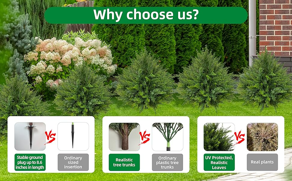 • [بدون صيانة ومتانة في جميع الأحوال الجوية]: مصنوعة من مواد فاخرة مقاومة للأشعة فوق البنفسجية، هذه الشجيرة المزيفة مصممة لتدوم طويلاً. تتحمل أشجار الأرز الموضعية الاصطناعية لدينا أشعة الشمس القاسية ورياح الشتاء والمطر دون أن تتلاشى أو تتلف، مما يضمن أن المساحة الخارجية الخاصة بك تبدو جميلة عامًا بعد عام دون أي جهد.