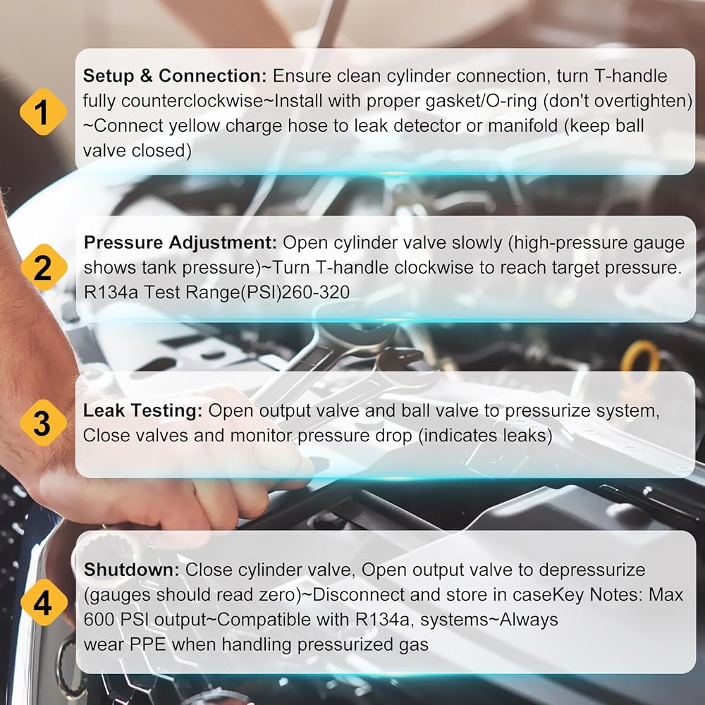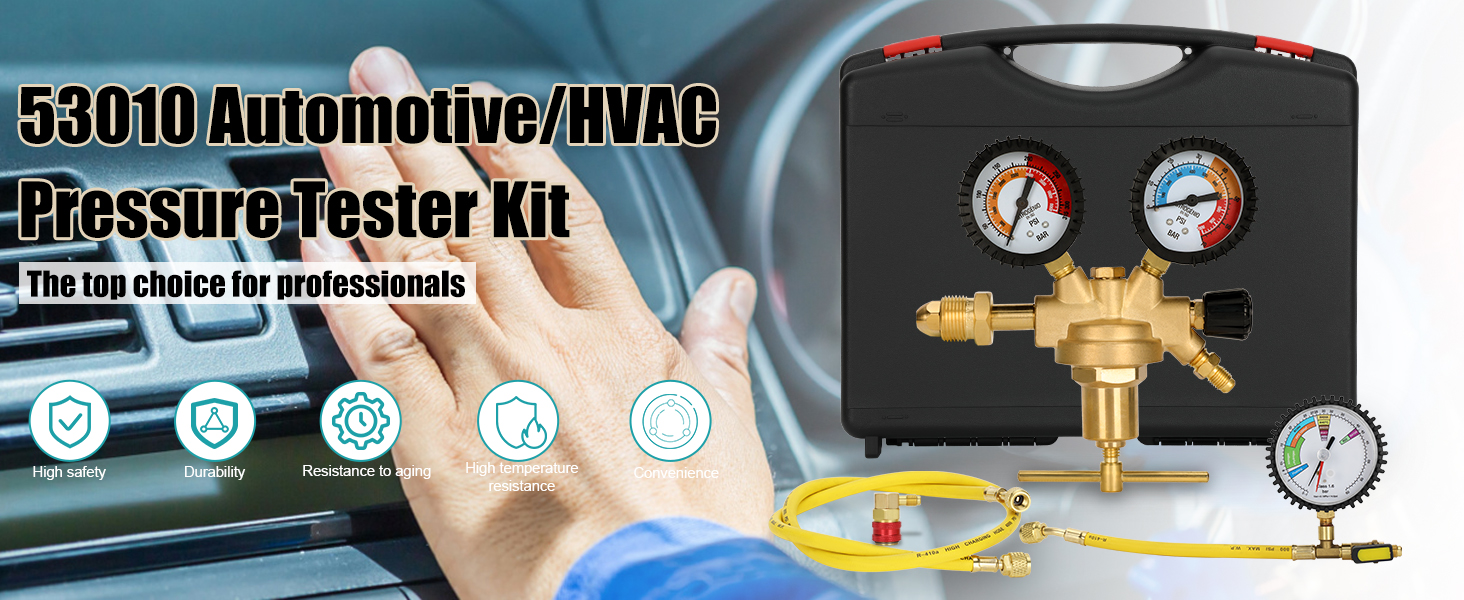 • مجموعة منظم اختبار الضغط 53010: تشتمل مجموعة اختبار ضغط السيارات الخاصة بنا على: منظم ضغط النيتروجين 53001، وخرطوم نفخ أصفر مقاس 38 بوصة، ومحول كشف التسرب، وموصل جانبي عالي الضغط R134a، بالإضافة إلى حقيبة شديدة التحمل مصبوبة بالنفخ لحمل جميع الملحقات، مما يعزز سهولة الحمل اليومي.