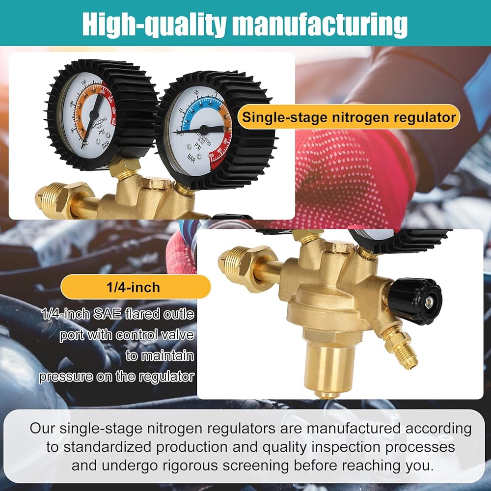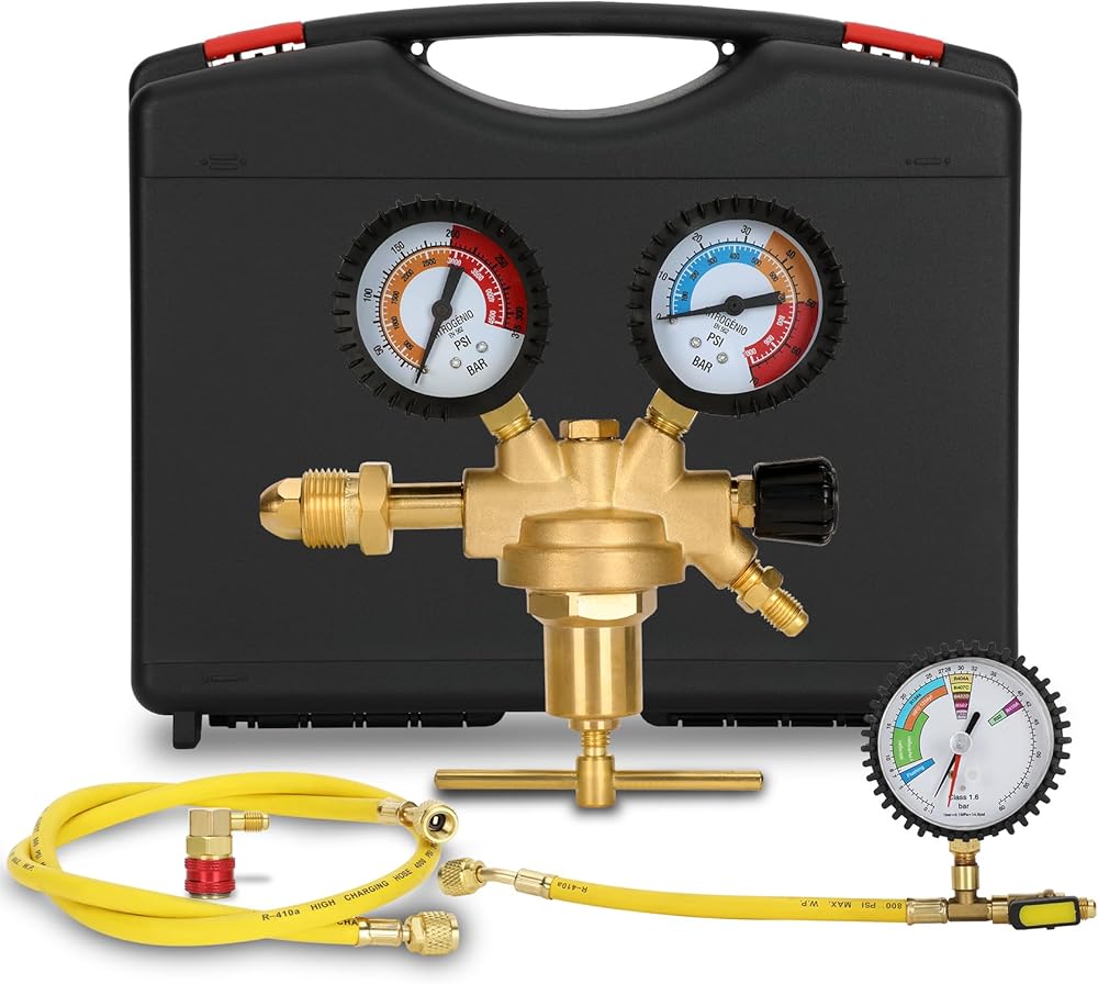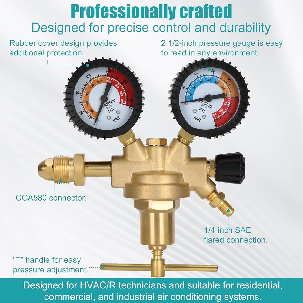 • تصميم احترافي: تم تصميم مجموعة اختبار الضغط HVAC هذه للمحترفين، وتتميز بمنفذ مخرج ذو حواف FL-M مقاس 1/4 بوصة مع صمام تحكم. يسهل المقبض على شكل حرف T تعديل الضغط، بينما يتيح مقياس الضغط مقاس 63 مم (2 1/2 بوصة) مع الغطاء الواقي إجراء اختبار دقيق لضغط النيتروجين.