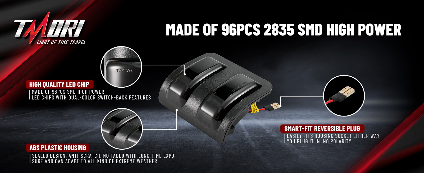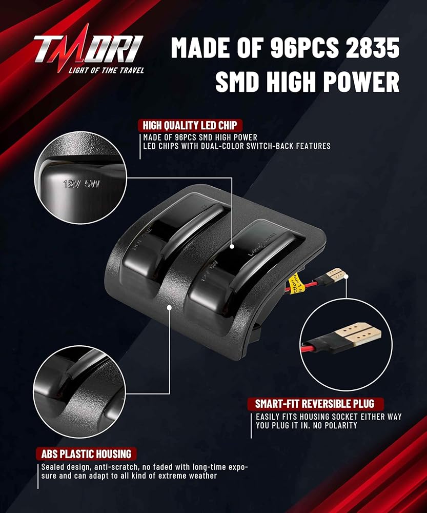 • 【مفتاح مزدوج اللون + 96 مصباح LED عالي الطاقة】تتميز مصابيح المرآة الجانبية TMORI F150 بـ 3 صفوف 96 شريحة LED عالية السطوع للحصول على أداء مذهل مزدوج اللون! قم بالتبديل دون عناء بين مصابيح التشغيل/وقوف السيارات البيضاء الواضحة (لأقصى قدر من الرؤية) وإشارات الانعطاف الديناميكية باللون الكهرماني (للحصول على تنبيهات لافتة للنظر) - مما يعزز السلامة على الطريق مع إضافة ترقية أنيقة وحديثة لشاحنتك