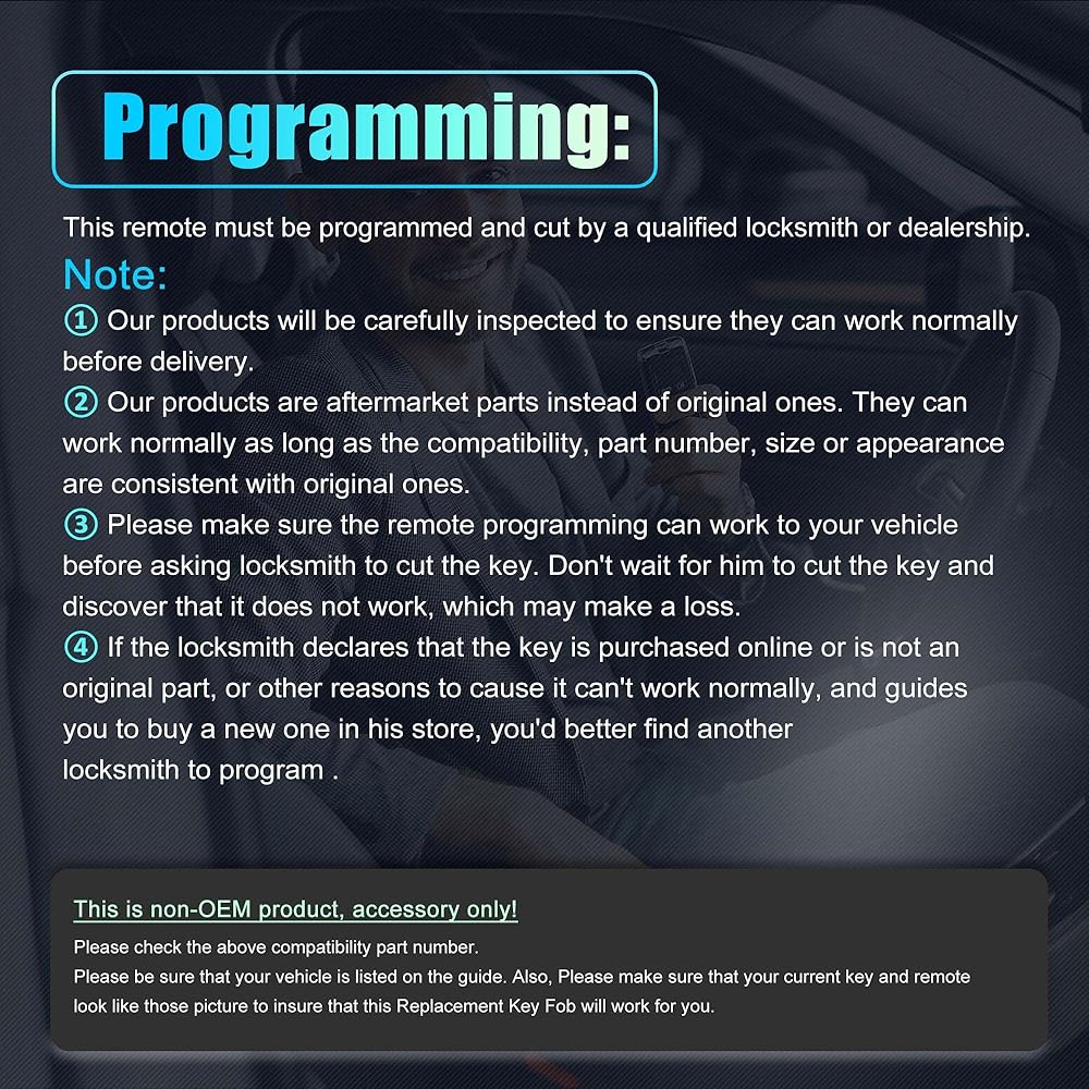• Notice Programming: This remote and door key must be programmed and cut by a qualified locksmith or dealership(consult some different locksmiths before programming to ensure it is successful). NOTE: a working key fob was needed in order to add a new key.