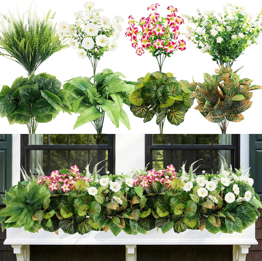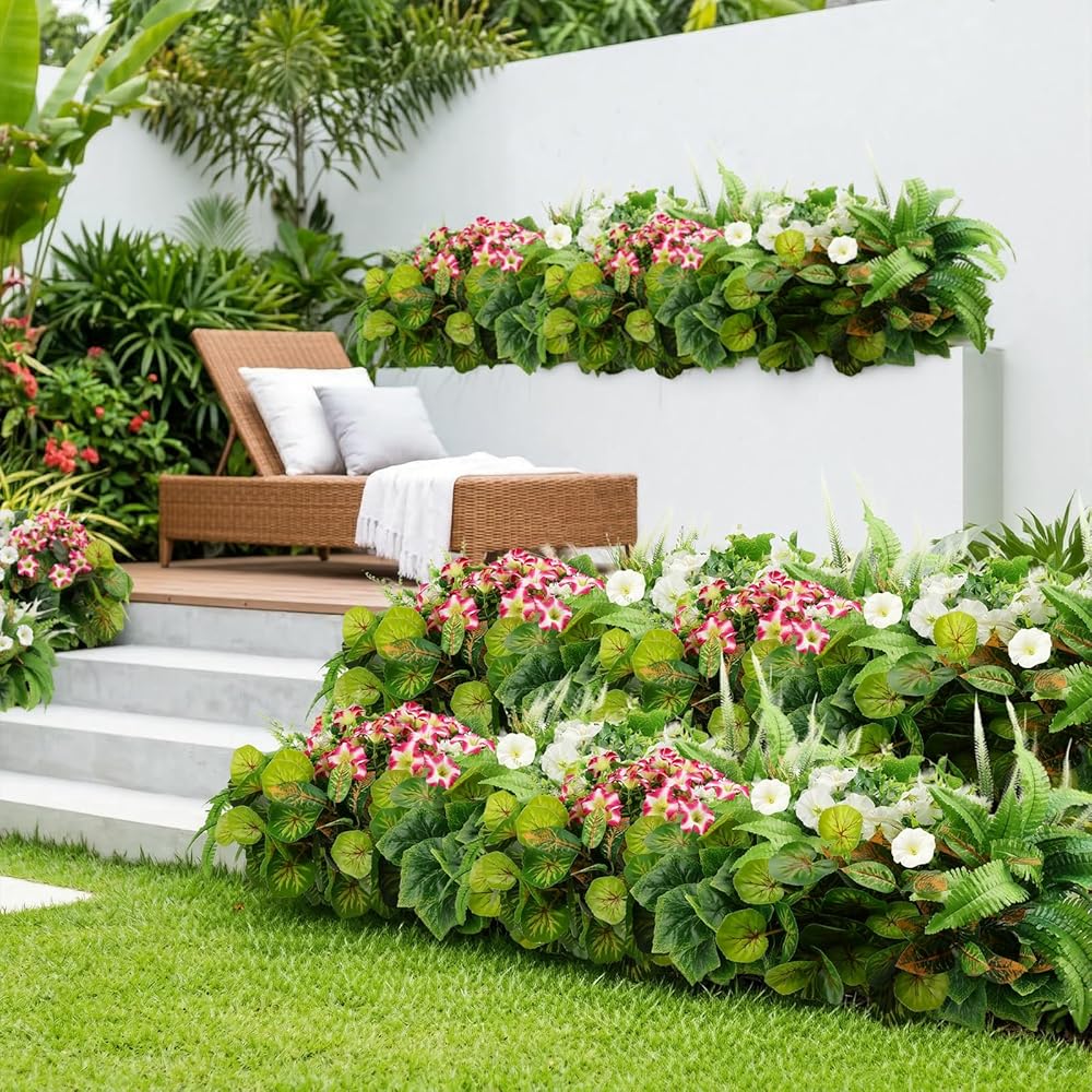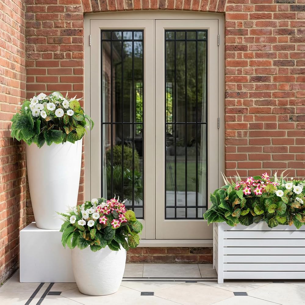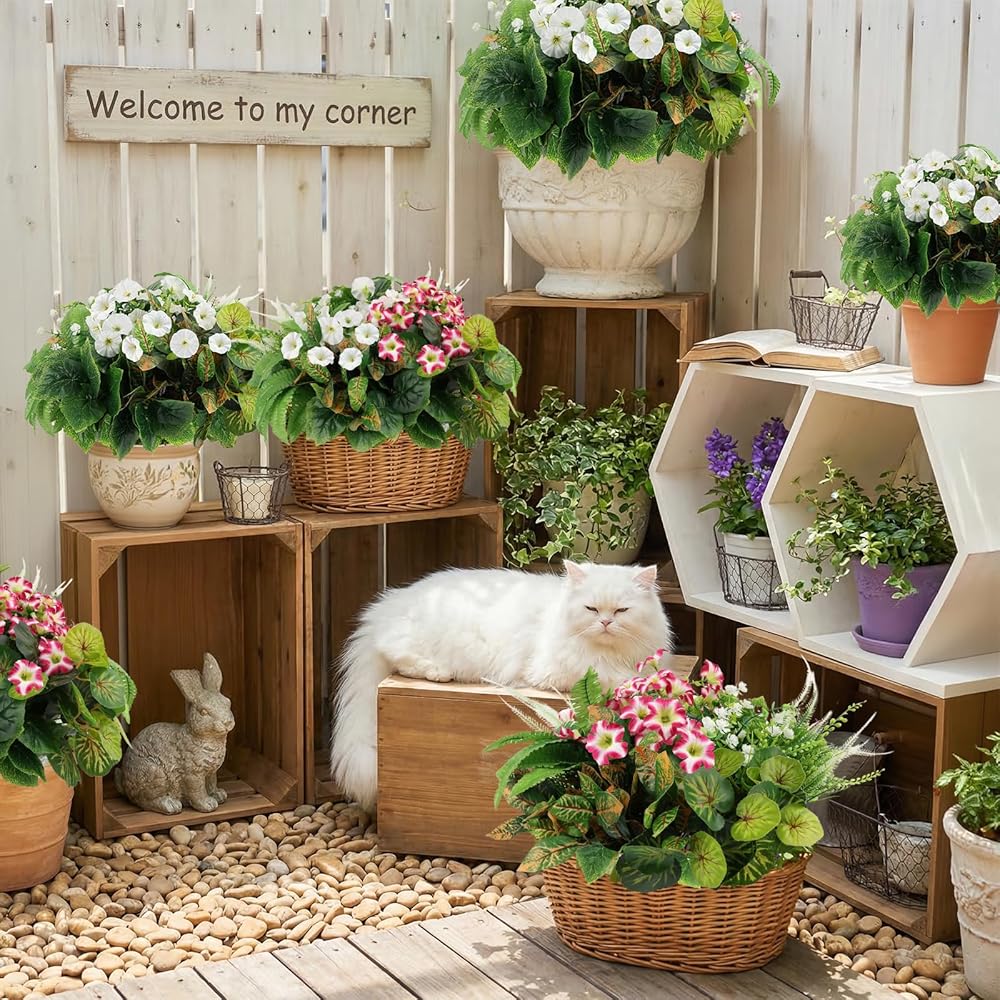 HOHOTIME نباتات صناعية في الهواء الطلق، خضرة صناعية وزهور واقعية مقاومة للأشعة فوق البنفسجية، بلاستيك بيجونيا صباح مجد الأوكالبتوس السرخس للديكورات الخارجية، فناء حديقة أمامية، ديكور ساحة الشرفة