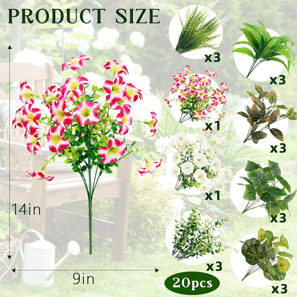مجموعة نباتات صناعية مختلطة واقعية، تتميز مجموعة النباتات الاصطناعية المكونة من 20 قطعة بمزيج جميل من النباتات الخضراء والزهور، بما في ذلك أوراق بيجونيا الملونة، ومجد الصباح، وزهور شاي الأوكالبتوس، والأعشاب المزخرفة. مصممة بملمس واقعي وألوان نابضة بالحياة، هذه النباتات الصناعية تخلق مظهرًا طبيعيًا وحيويًا لأي مساحة داخلية أو خارجية. توفر هذه الحزمة الشاملة كل ما تحتاجه لإنشاء ترتيب كامل ذو مظهر احترافي.