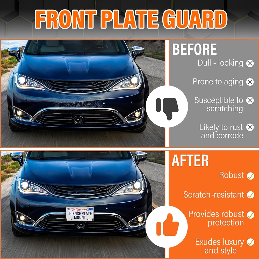 توافق مثالي: مصمم خصيصًا ليتوافق حصريًا مع Chrysler Pacifica Voyager 2017-2022، يوفر حامل لوحة الترخيص هذا ملاءمة تشبه المصنع. تم تصميمه بدقة متناهية، فهو يتماشى بسلاسة مع محيط المصد الأمامي لسيارتك، مما يمنع أي تخمين.