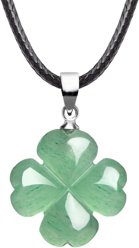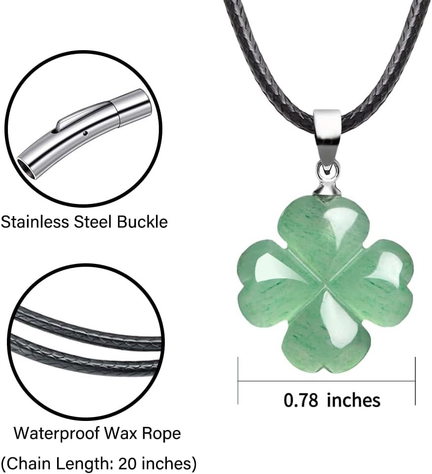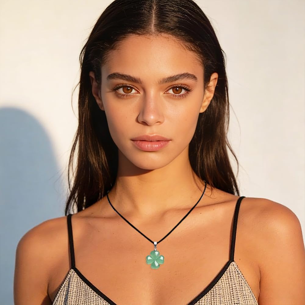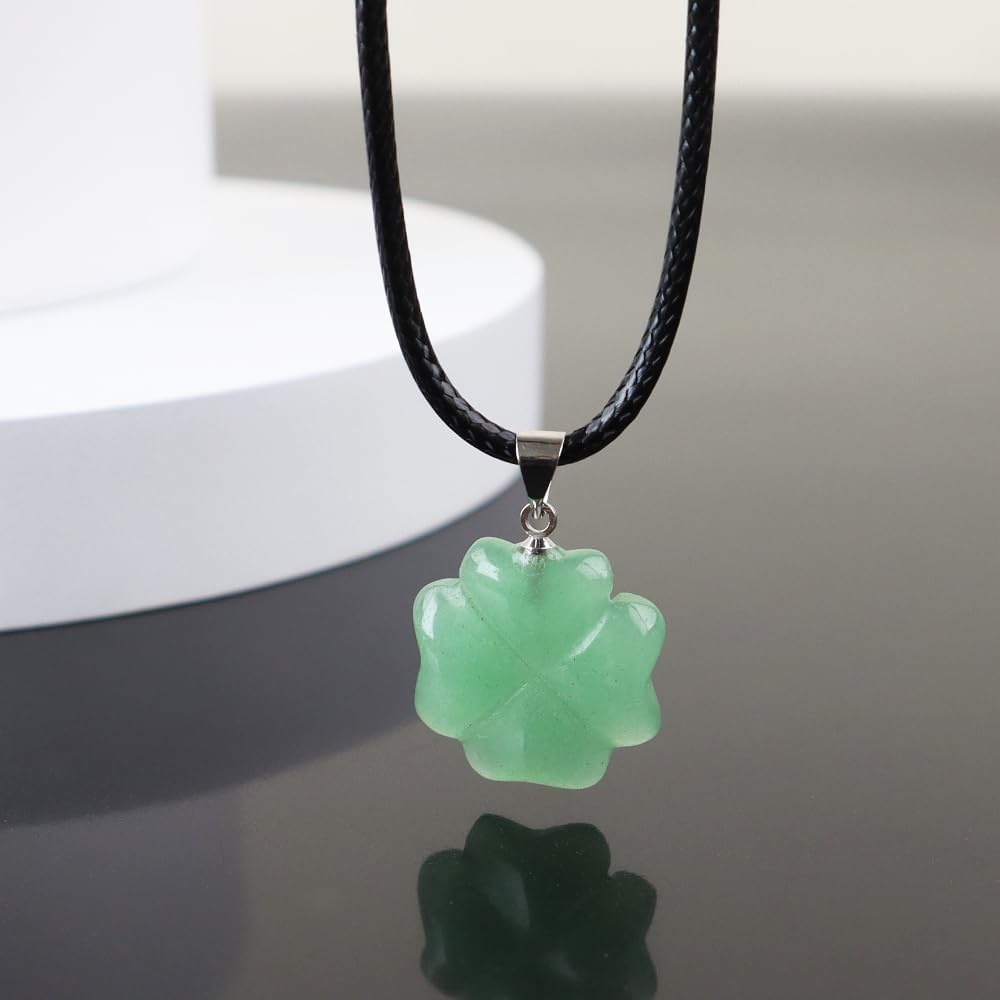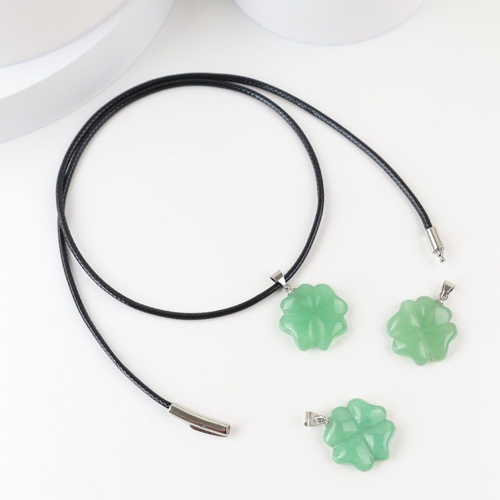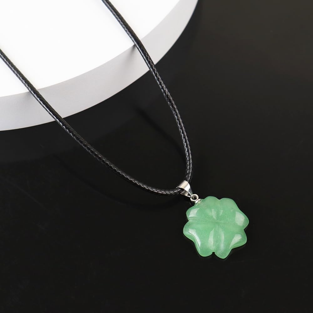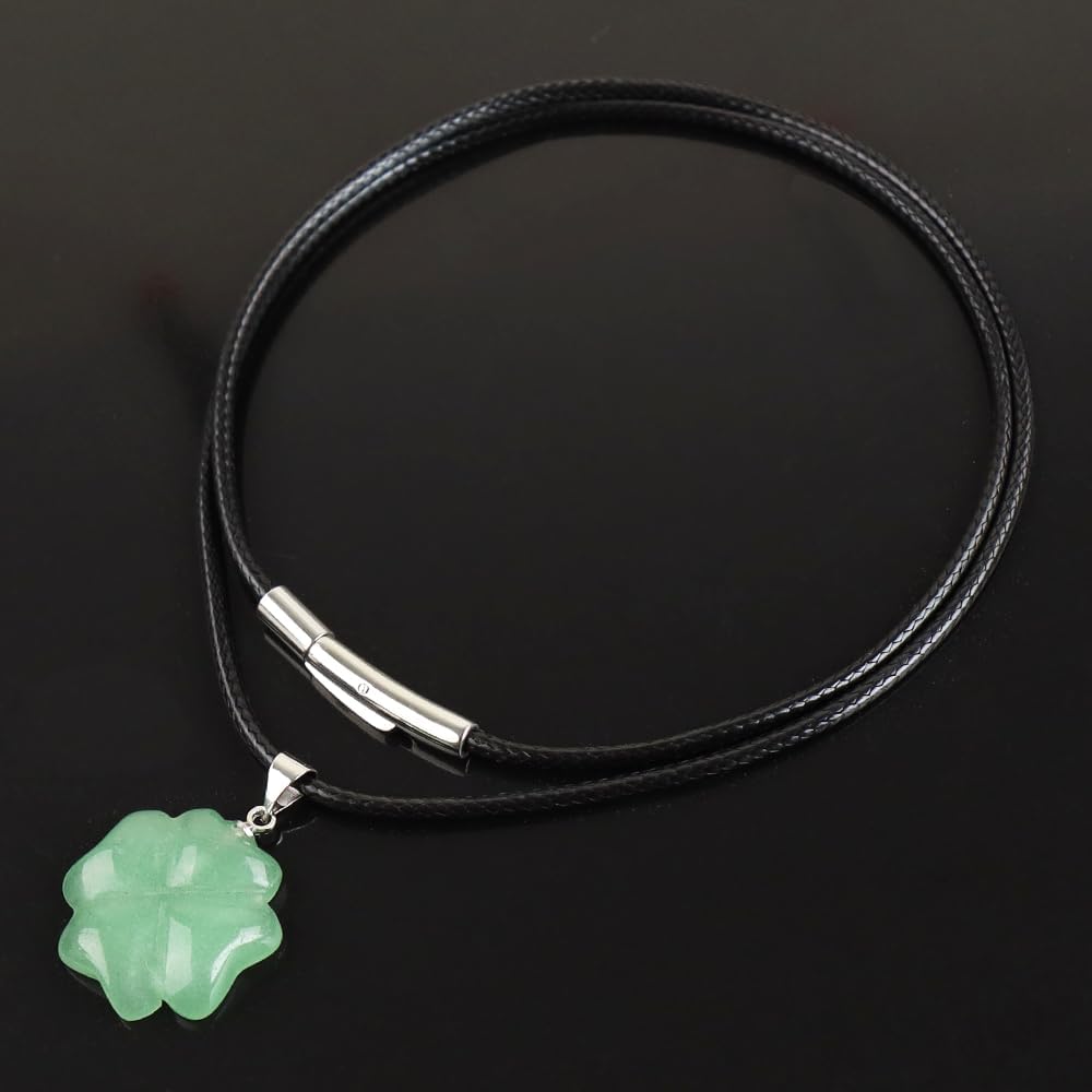 Natural Green Aventurine Four Leaf Clover Pendant Necklace for Faith Hope Love and Luck Black Rope Chain St. Patrick's Day
