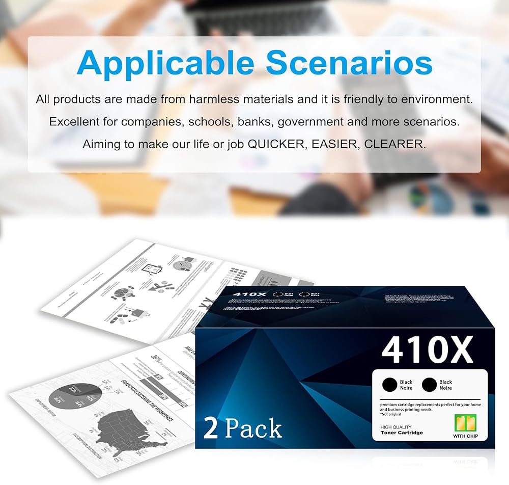 خراطيش حبر أسود 410X (عبوة من قطعتين) بديلة لحبر HP 410X عالي الإنتاجية تعمل مع سلسلة Color LaserJ Pro M452 Color LaserJ Pro MFP M377 M477 Series | CF410XD