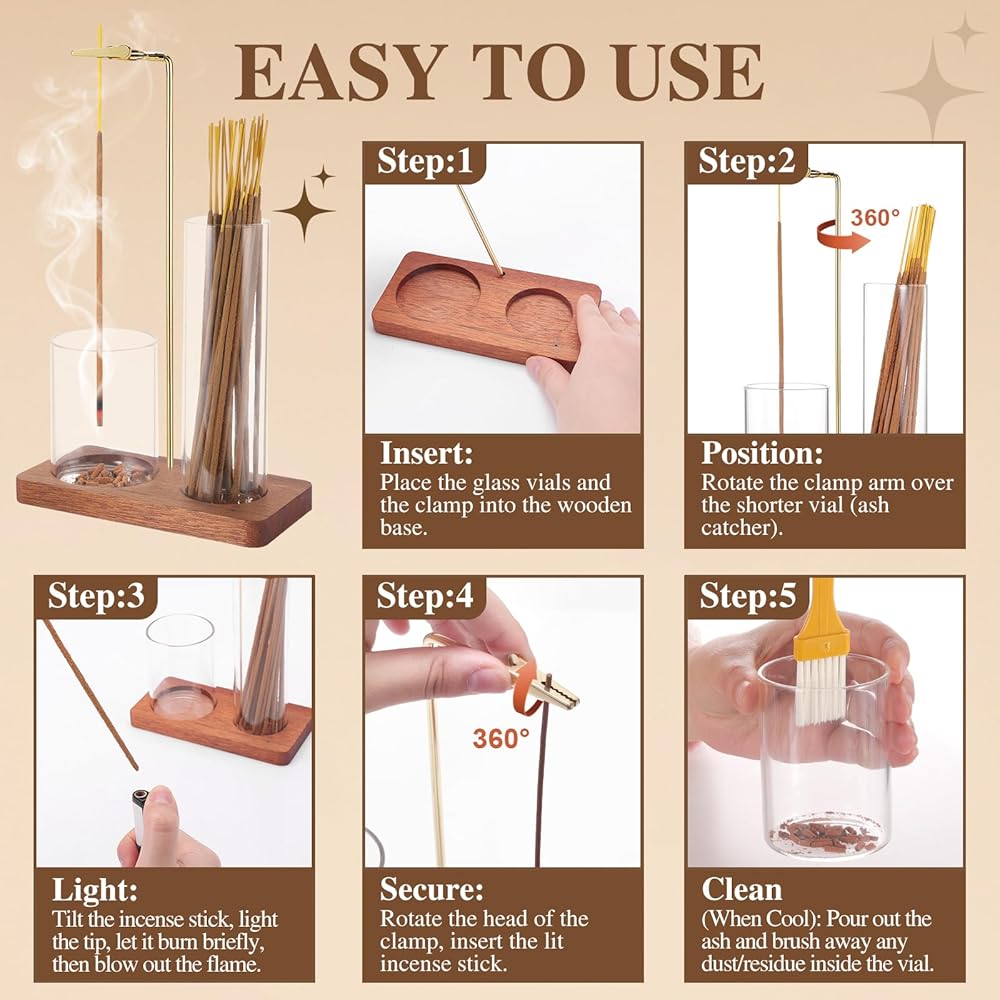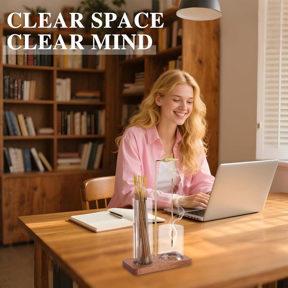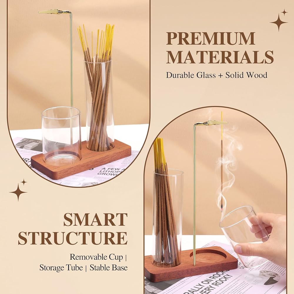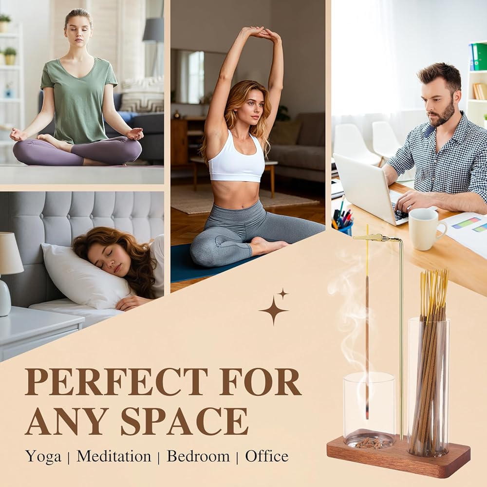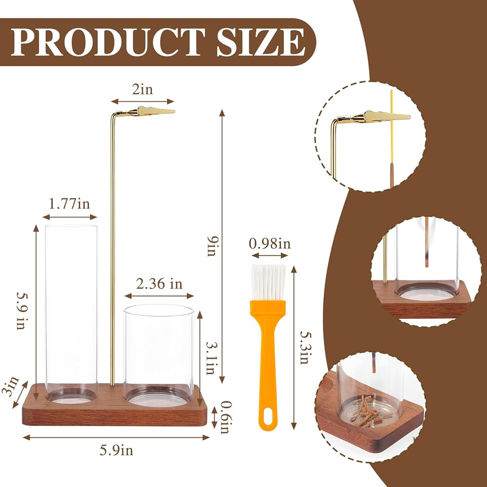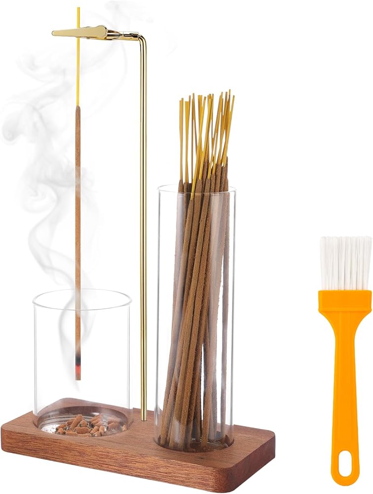 Discover a new way to enjoy incense with this thoughtfully designed 2-in-1 wooden incense holder. The elegant 8-shaped base, crafted from natural wood, is more than just visually appealing—it provides stability and balance for a clean and enjoyable burning experience. Whether placed on a shelf, desk, or meditation corner, it adds a touch of artistry to any space. This incense burner set includes two glass cups of different heights. The taller cup is designed to hold incense sticks securely, while the shorter one functions as an ash catcher, keeping your surfaces neat and free from residue. With its dual-purpose design, you can enjoy the fragrance of your favorite incense while maintaining an organized and clutter-free environment. A sturdy metal rod with a crocodile clip extends from the base, offering a modern twist to traditional incense burners. The clip holds incense sticks firmly in place, preventing slips or spills, and ensuring safe, steady burning every time. Perfect for aromatherapy, yoga, meditation, or spa sessions, this incense holder transforms any setting into a serene retreat. Its blend of functionality and artistic design makes it more than just an incense accessory—it's a decorative piece that enhances relaxation and mindfulness. Whether used in your home, office, or as part of a spiritual practice, this versatile incense organizer is also an excellent gift choice. Share tranquility and elegance with friends and loved ones who appreciate both style and serenity in their daily rituals.