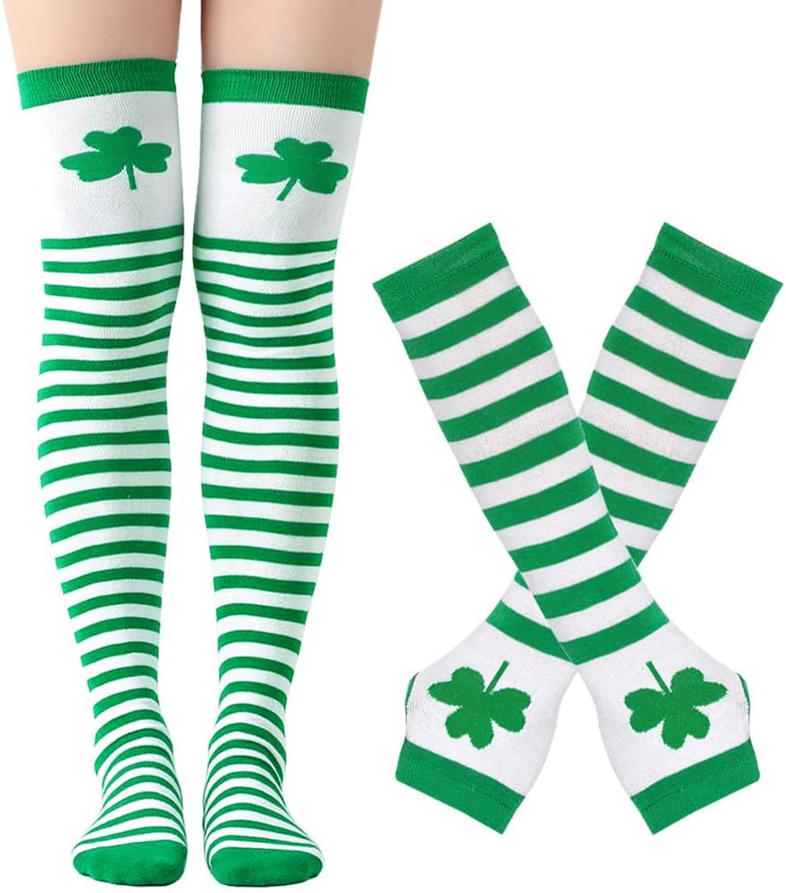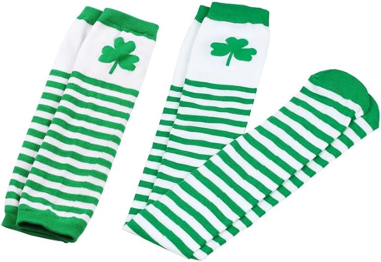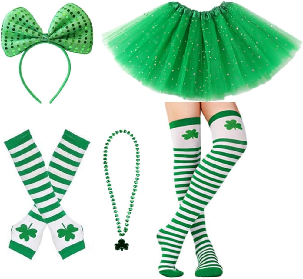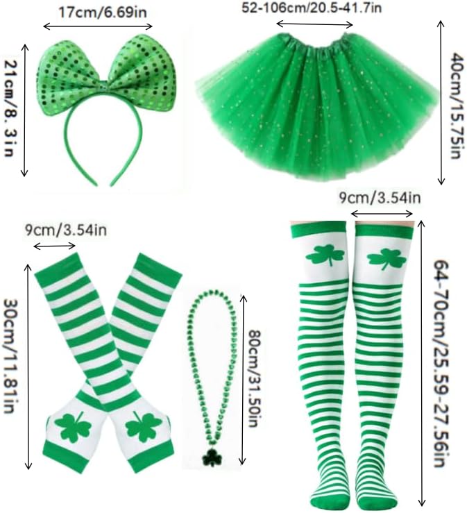 5PCS St. Patrick's Day Accessories: The package includes 1 piece of green sequin star tutu skirt, 1 pair of arm warmer gloves, 1 pair of knee socks, 1 piece green bowtie headband, 1 piece shamrock necklace for a complete St. Patrick's Day ensemble