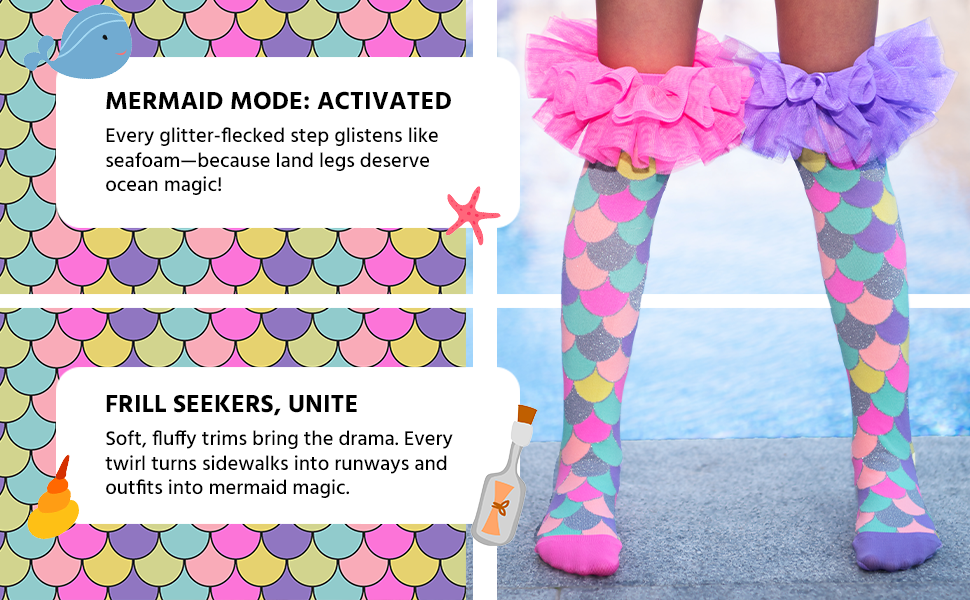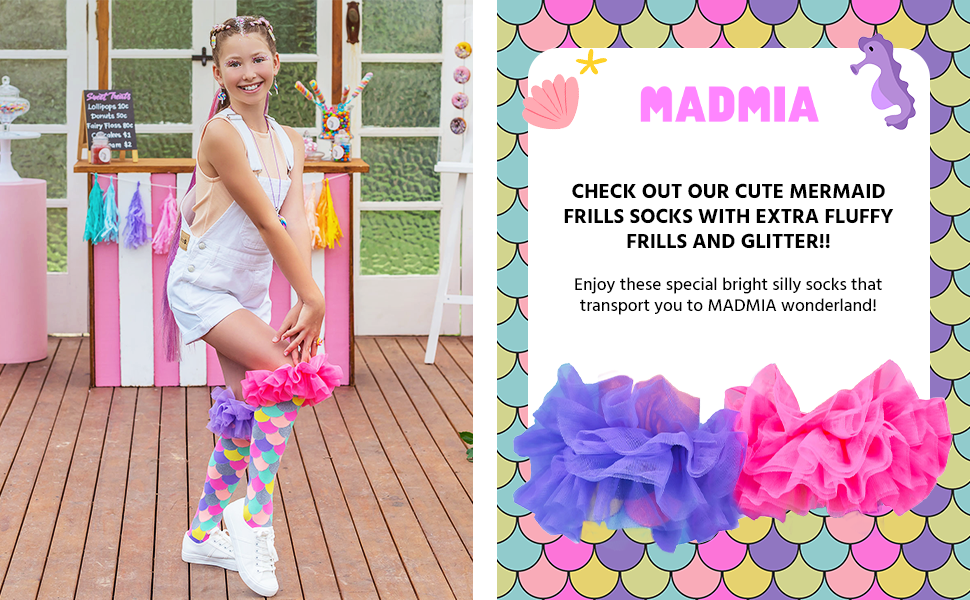 حب حورية البحر: إصدار خاص محدود من الجوارب المستوحاة من حورية البحر مع زخرفة زغبية إضافية ولمعان في جميع أنحاء التصميم! سوف تخلع جوارب الجميع بارتداء جوارب MADMIA Mermaid Frills الرائعة.