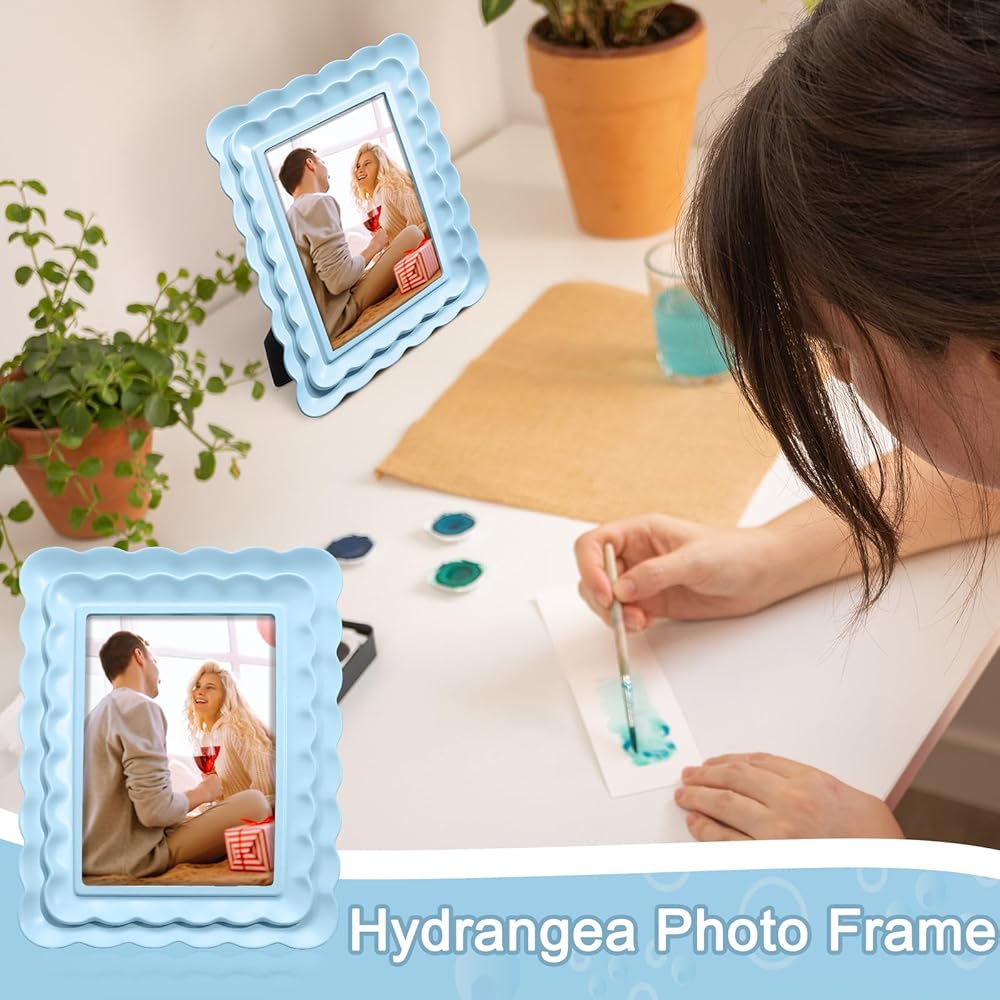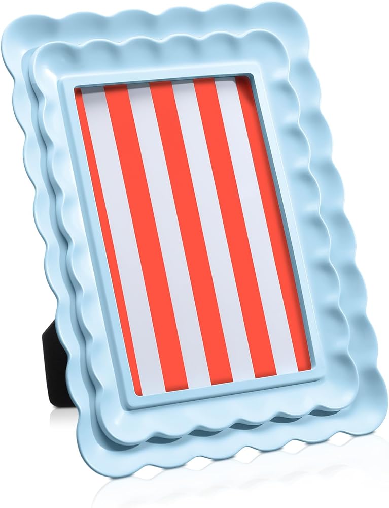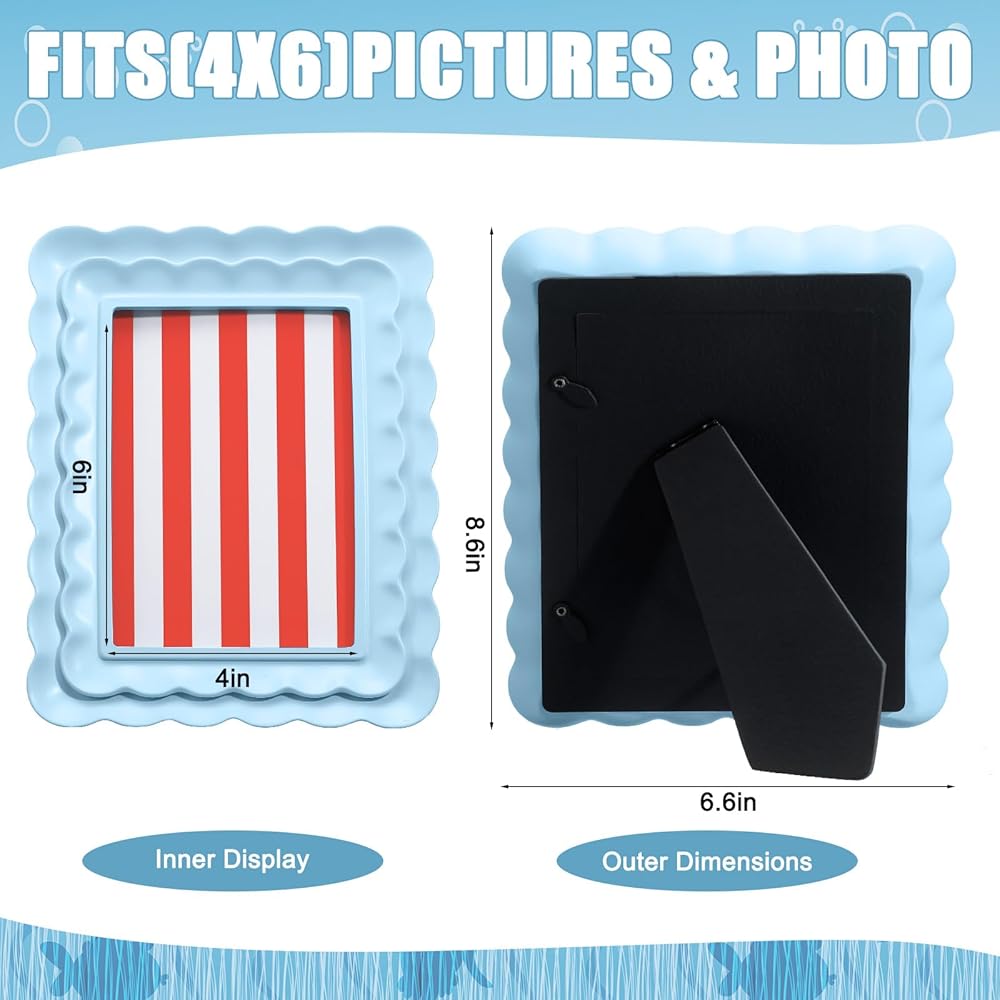 Elevate your cherished memories with our elegant 4 x 6 inch blue scalloped picture frame. Made from resin, this frame offers a steady and sophisticated touch to any space. Ideally sized, it fits effortlessly on your desk or shelf, adding color and ensuring your photos stand out.