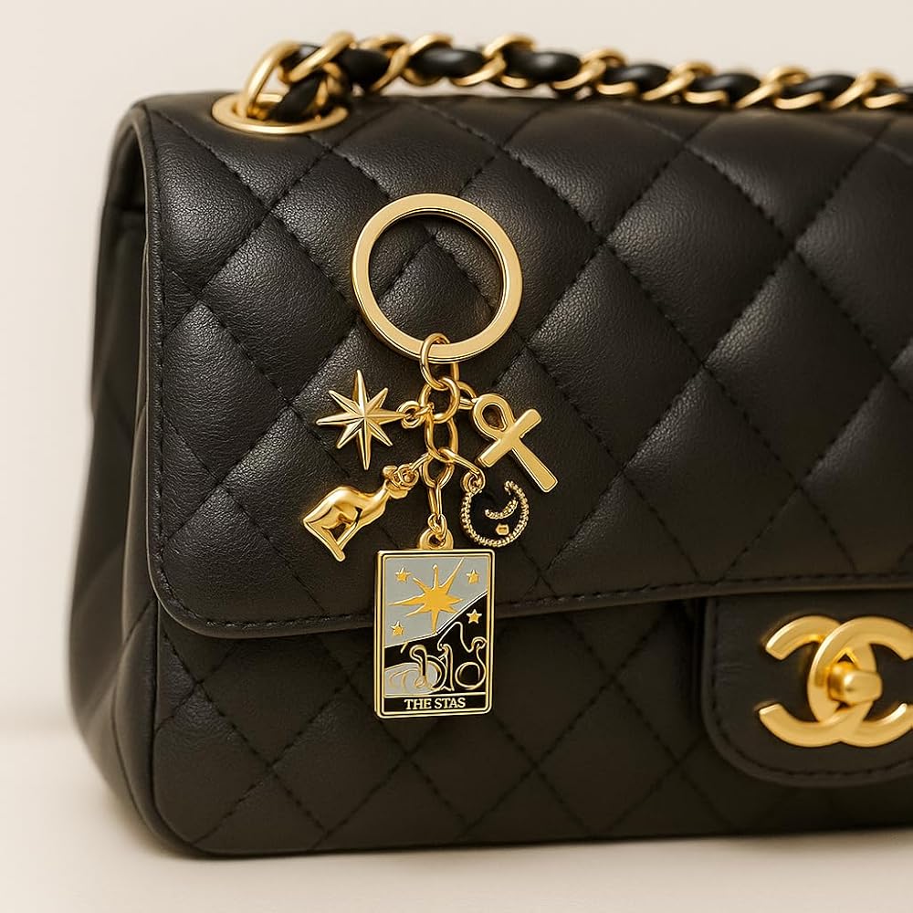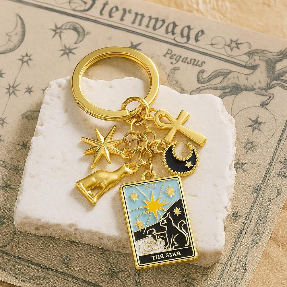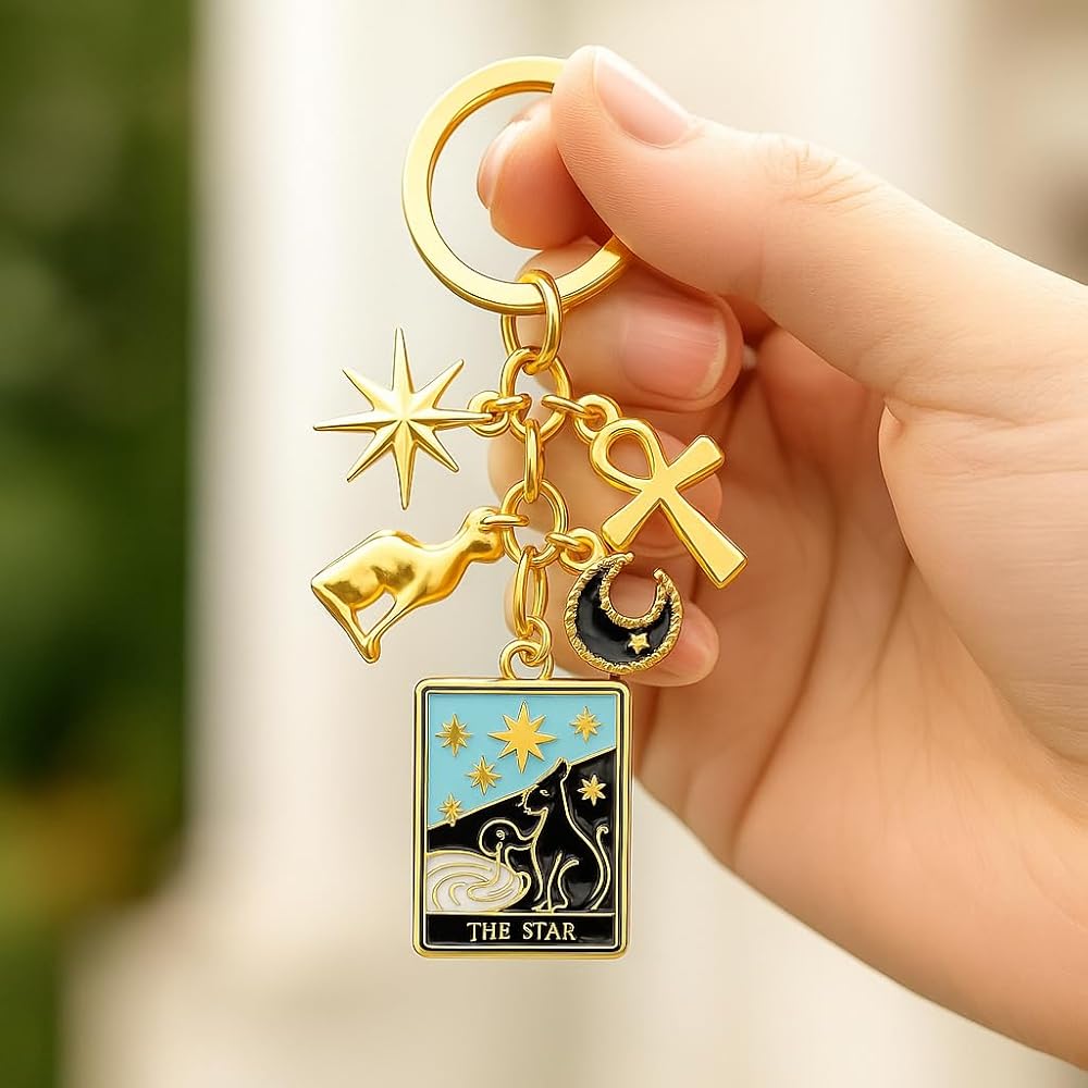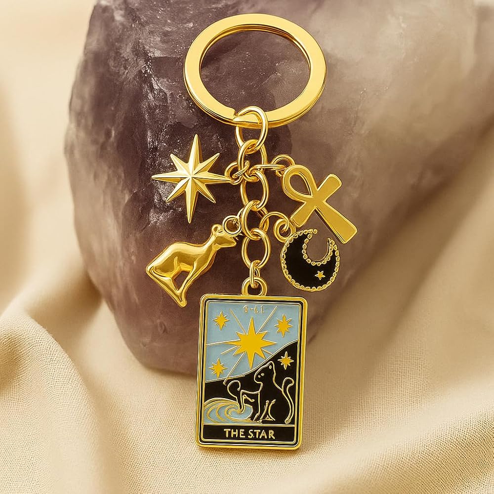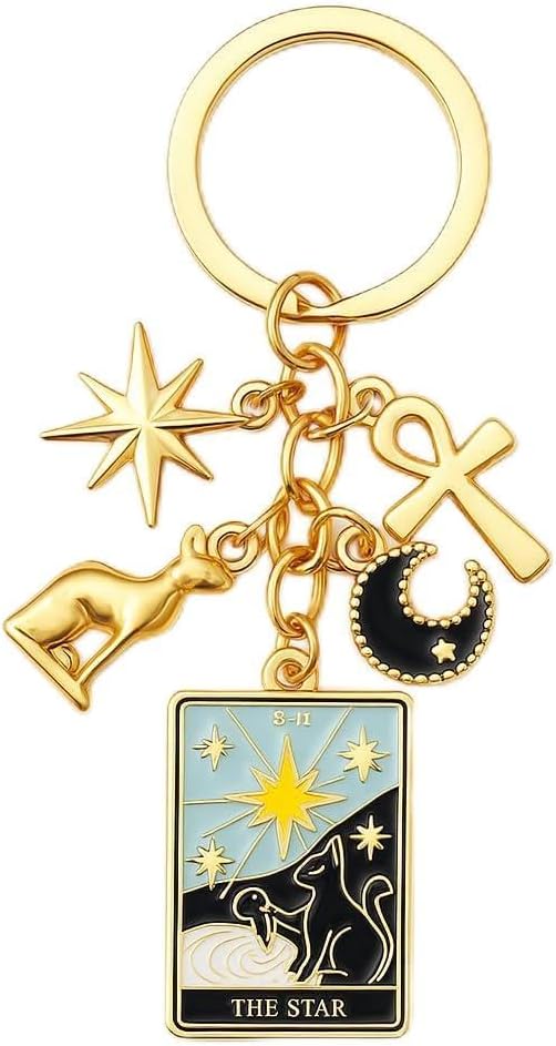 Step into a realm of hope, healing, and intuitive guidance with our Enchanting Tarot 'The Star' keychain, a meticulously crafted accessory that radiates mystery and sophisticated charm. This exquisite piece features a gleaming gold keychain from which a captivating array of mystical elements gracefully dangles, each imbued with a sense of ancient wisdom and inspiring symbolism. The central focus is an intricately detailed 'THE STAR' Tarot card charm, its design featuring shimmering stars, a serene cat, and flowing waters, masterfully conveying its meaning of profound hope, emotional healing, and divine future guidance. Alongside, a vibrant golden star charm radiates pure cosmic energy, and a black and gold moon charm dotted with stars calls forth the mysteries of the night sky. These are further complemented by a powerful golden Ankh symbol, representing life and eternity, and a unique golden kangaroo charm, adding an intriguing layer of personal symbolism and a touch of the unexpected to this thoughtful collection. It's more than just a keychain; it's a wearable beacon for the spiritually curious and a captivating bag charm for women who embrace mysterious aesthetics and meaningful accessories.