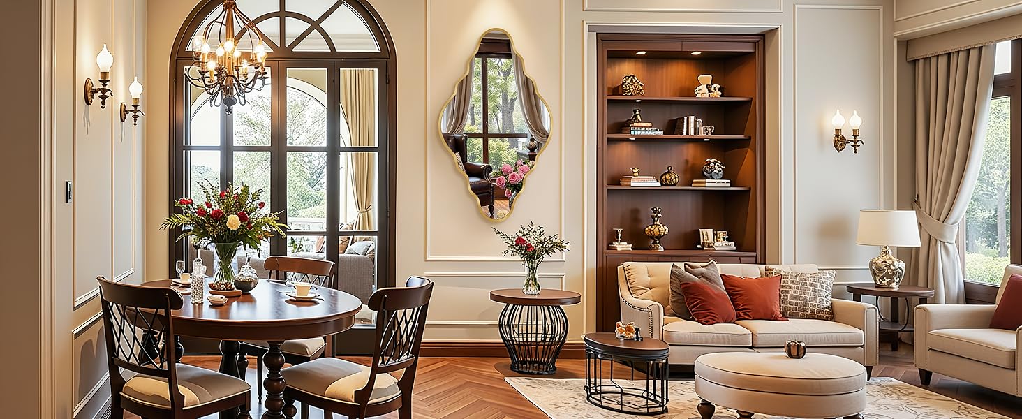 سحر متعدد الاستخدامات: مثالية كمرآة ذهبية عتيقة لغرفة معيشتك، أو وضعها فوق منضدة الحمام، أو بمثابة قطعة ديكور أنيقة في المداخل وغرف النوم، فهذه المرآة البيضاوية تزيد من جاذبية أي بيئة.