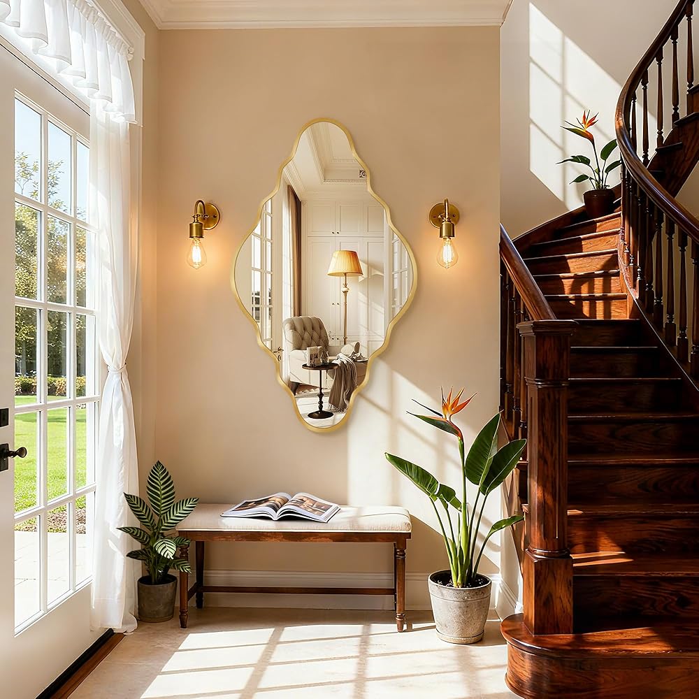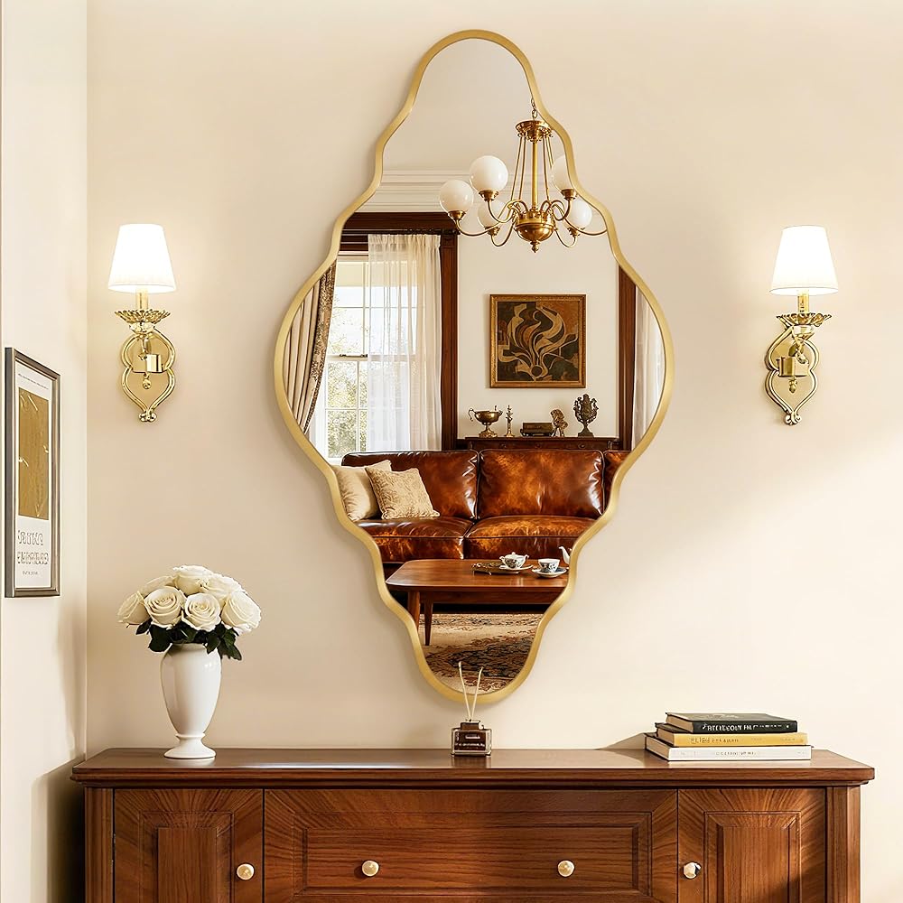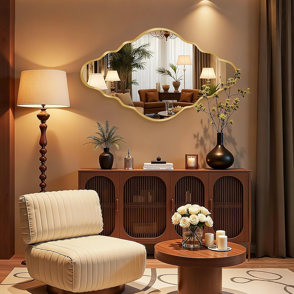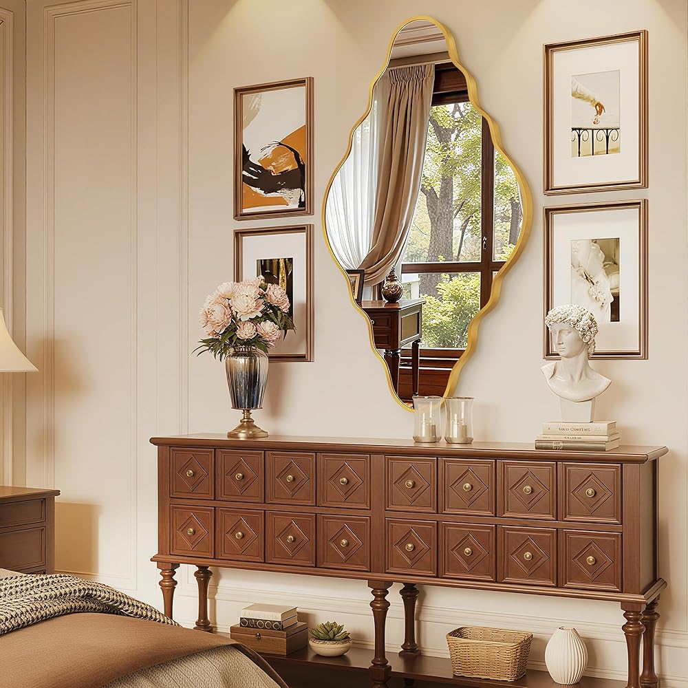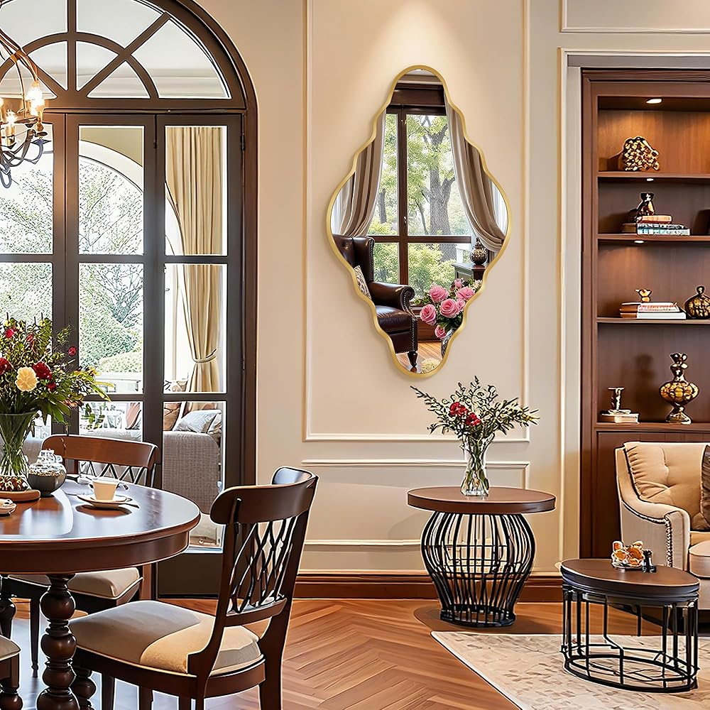 تصميم أنيق: تتميز هذه المرآة العتيقة بمظهر ذهبي مموج مميز، مما يضفي إحساسًا غنيًا بالأناقة والرقي العصري. تصميمه الفريد والجذاب يمكن أن يعزز بشكل مثالي نمط أي غرفة.