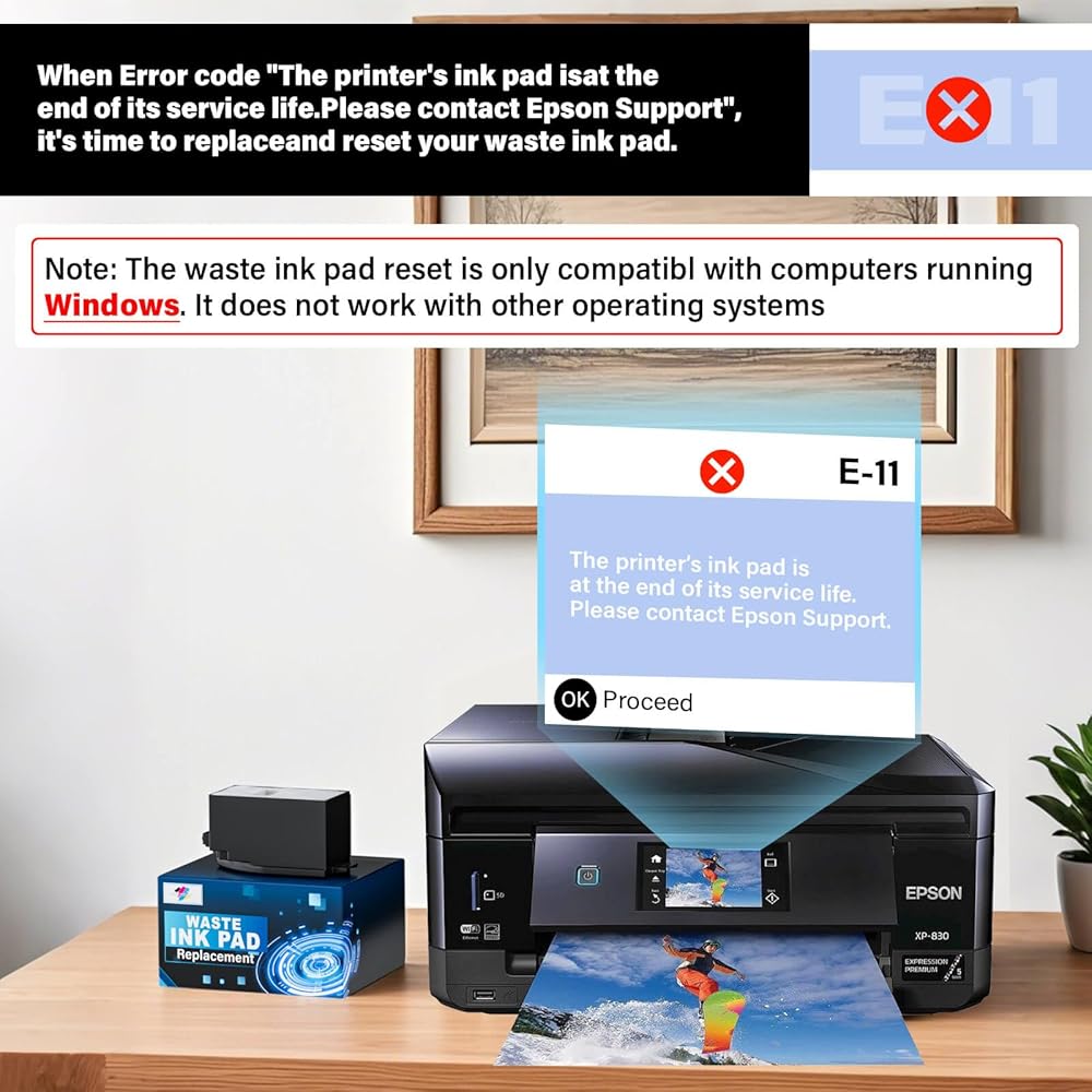 • Printer E-11 error code: Replacing the waste ink pad and using the reset software will resolve the printer E-11error code "Waste ink pad and maintenance box end of life".