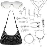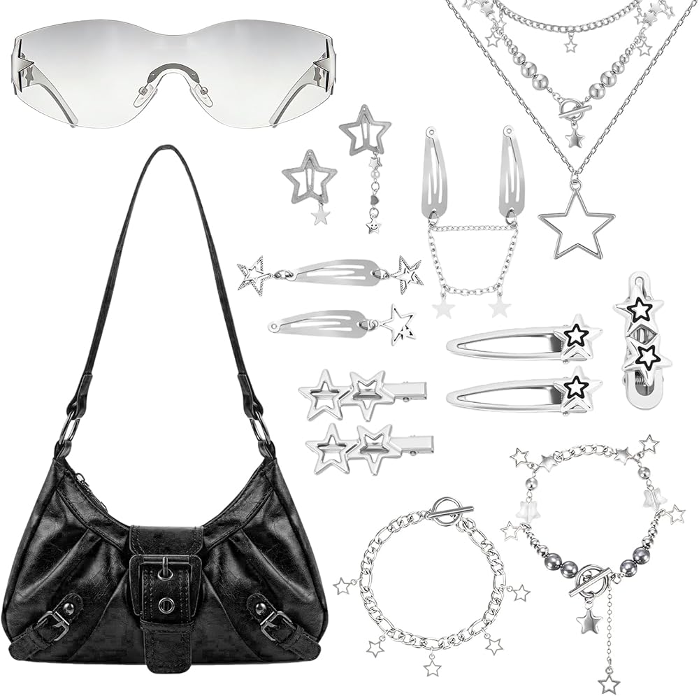 إكسسوارات Y2k للنساء، تتضمن المجموعة محفظة Y2k، ومشابك شعر على شكل نجمة فضية، وسوار على شكل نجمة، وقلادة Y2k ونظارات شمسية Y2k، وإكسسوارات الجرونج لمعظم الأشخاص