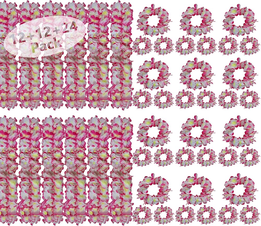 Get ready to celebrate in style with our 48-Pack Hawaiian Leis Set, featuring 12 flower necklaces, 12 headbands, and 24 wrist leis—the perfect accessories for a tropical flair. Each necklace has 30 flower petals, the headbands include 12 petals, and each bracelet includes 6, all made from premium polyester and artificial silk for a fuller, more vibrant appearance. These leis are great for a variety of seasonal and holiday events. The orange leis are perfect for fall-themed parties, Halloween costumes, and Thanksgiving gatherings, bringing a warm, festive touch. Their photogenic colors make them ideal for travel, and they add a fun, tropical vibe to holiday vacations, cruise trips, and beach getaways The multicolor set offers versatility and is perfect for Christmas parties, school events, or birthday celebrations. Whether you're looking for the tropical decoration for your wedding, a photo prop for your next New Year's Eve party, or an accessory for a destination wedding, these leis will fit any occasion. With their adjustable design, these leis are suitable for both adults and children, making them good for family gatherings, group celebrations, and any event requiring a tropical twist. Reusable and lightweight, the leis come vacuum-sealed for easy storage, and with a quick fluff, they're ready to wear for any party or celebration. Hawaiian leis set