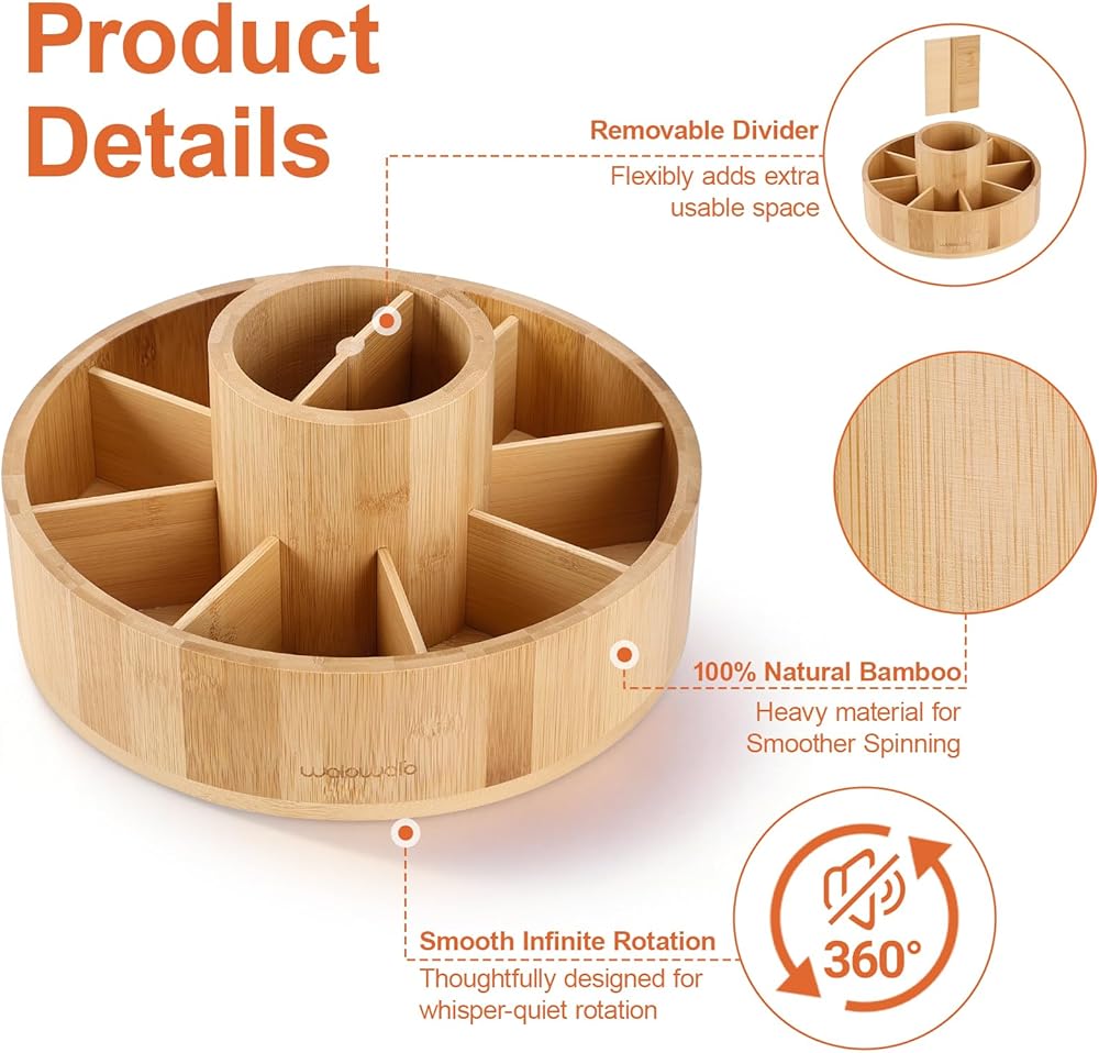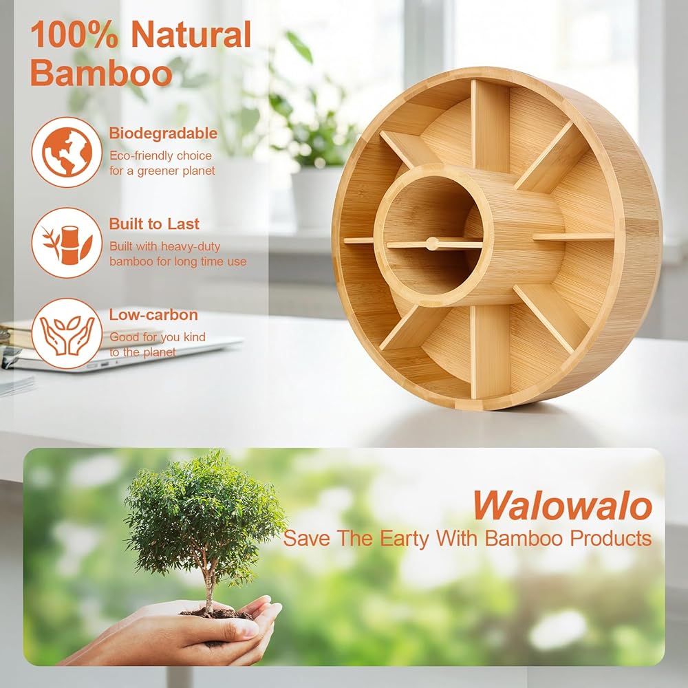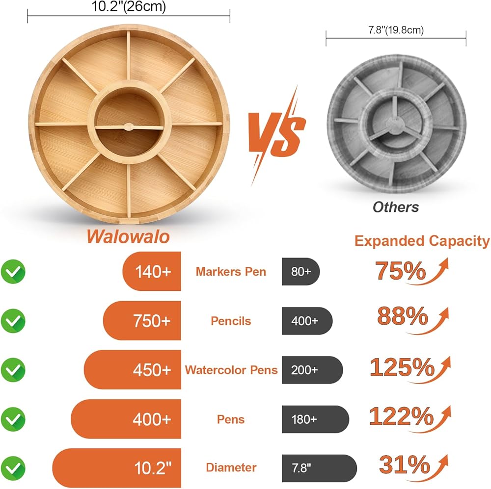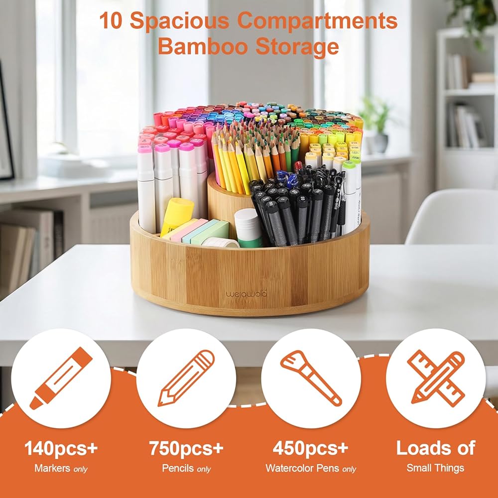 منظم مكتب من الخيزران الدوار، علبة صامتة تدور بزاوية 360 درجة، علبة مستلزمات فنية مكونة من 10 أقسام تحمل أكثر من 140 علامة، وأكثر من 750 قلم رصاص للمكتب المنزلي، والفصول الدراسية، وهدية عيد ميلاد، مقاس كبير 25.4 سم