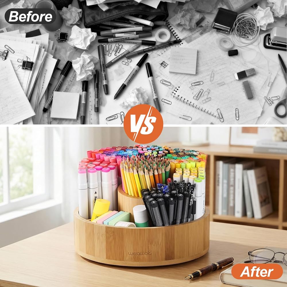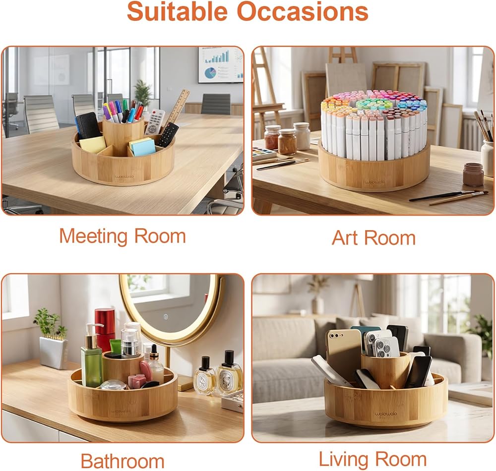 تجميع خالٍ من الأدوات وسطح سهل التنظيف - قم بتجميع علبة المكتب الدوارة هذه في 5 دقائق مسطحة - لا توجد حاجة لأي أدوات! يتم تنظيف سطح الخيزران الناعم بقطعة قماش مبللة، لذلك تختفي بقع الأقلام أو الغبار أو انسكابات القهوة في ثوانٍ. إنه حل تخزين منخفض الصيانة للمنازل والمكاتب المزدحمة - بدون أي ضجة، مجرد تنظيم وظيفي.