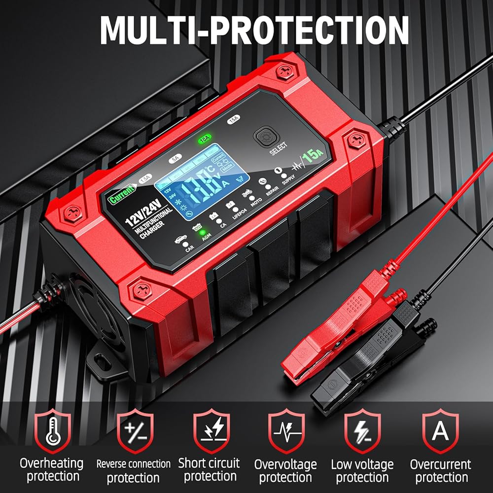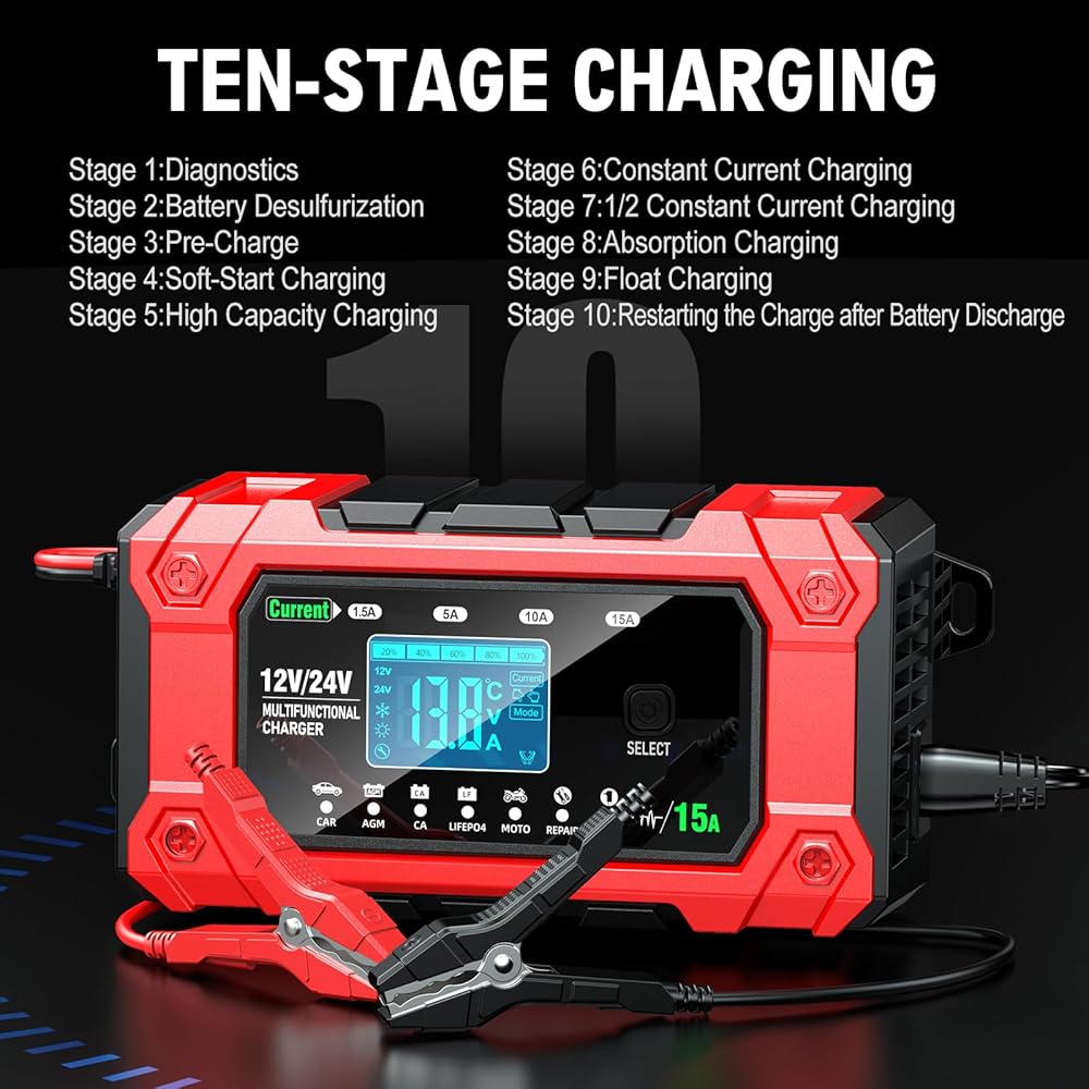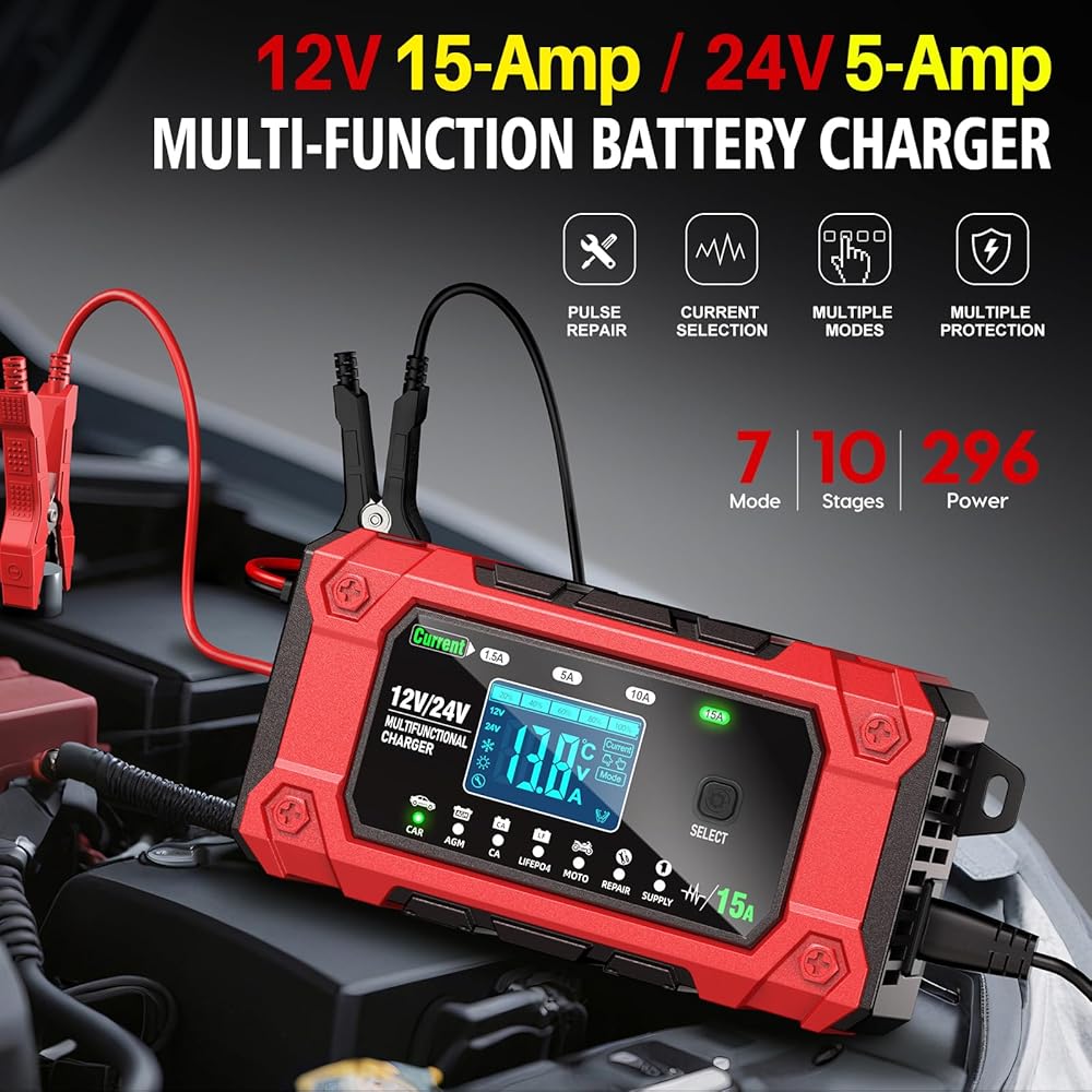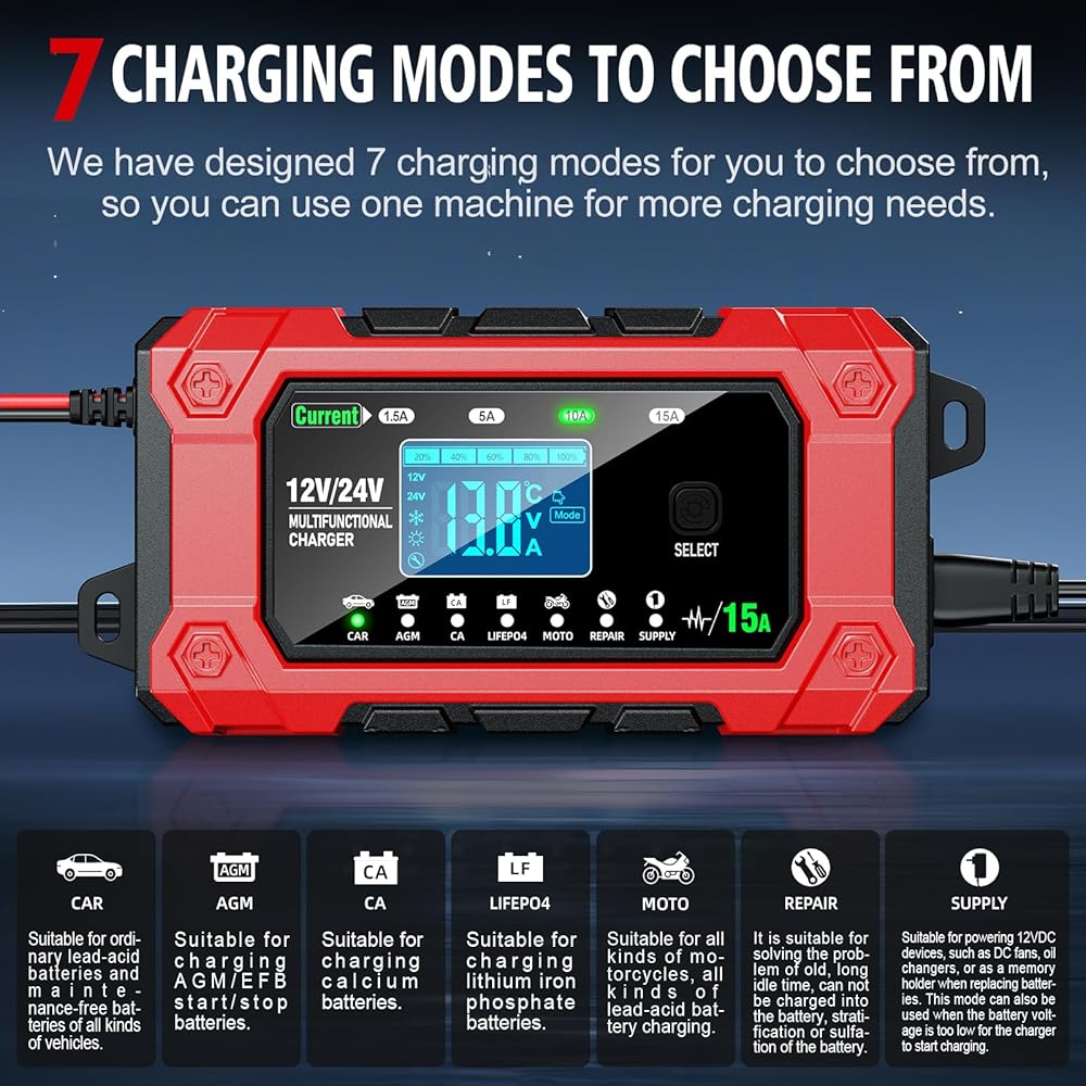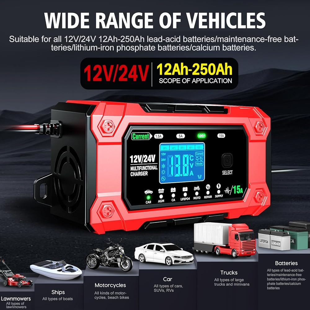 【شحن ذكي، مجموعة واسعة من التطبيقات】 شاحن بطارية ذكي أوتوماتيكي بالكامل 12 فولت 15 أمبير و24 فولت 5 أمبير مع وظائف قوية. إنه بمثابة حل الكل في واحد: الشاحن، والمحافظ، والشاحن المتقطر، ومزيل الكبريت. مناسبة لشحن وصيانة جميع بطاريات الرصاص الحمضية 12 فولت و24 فولت، بما في ذلك بطاريات AGM وGEL وSLA وLiFePO₄، للسيارات والشاحنات وسيارات الدفع الرباعي والدراجات النارية وجزازات العشب والقوارب والمزيد.