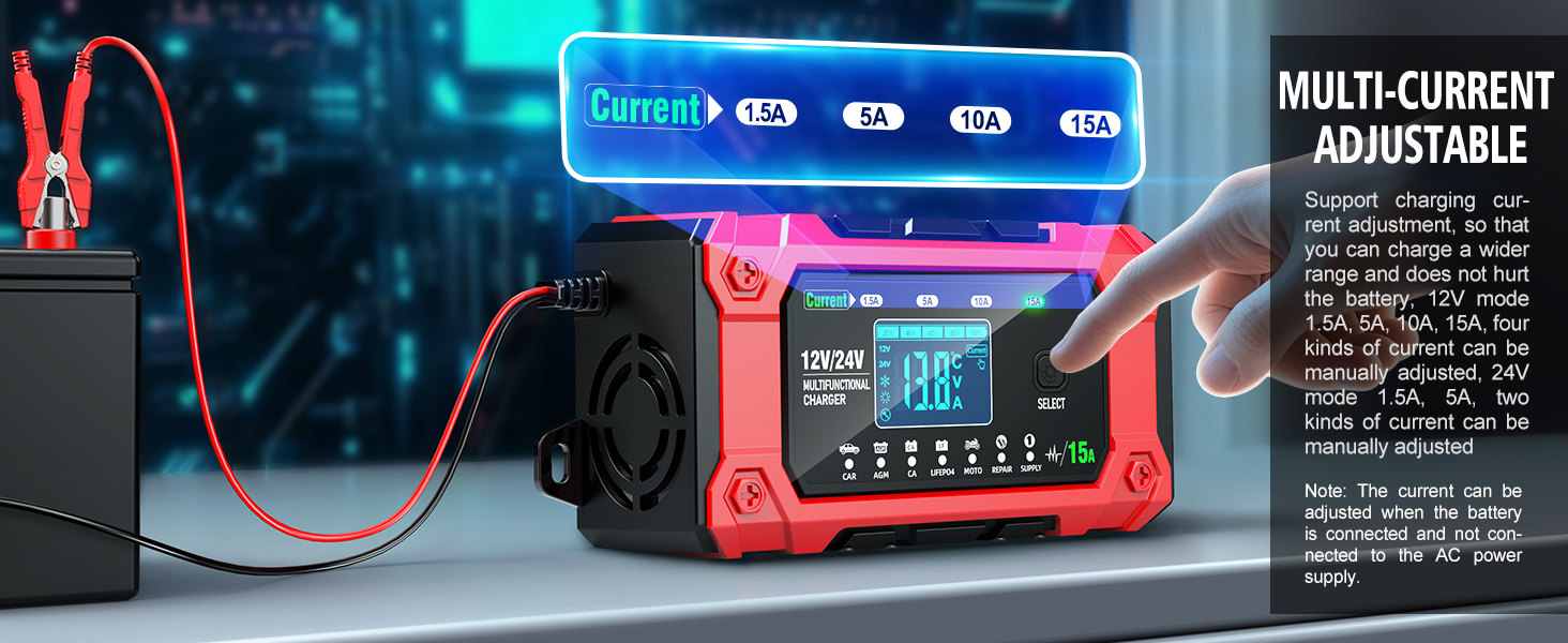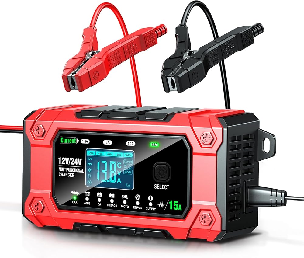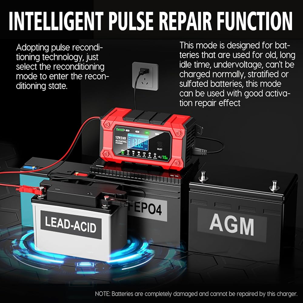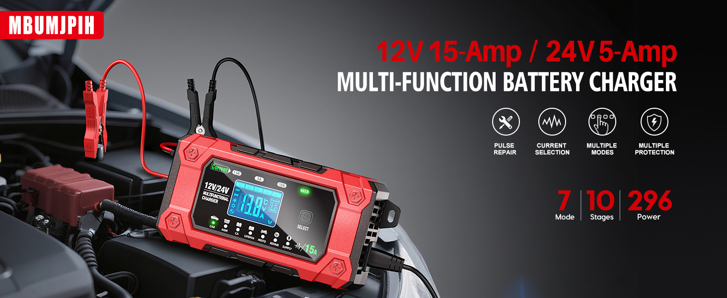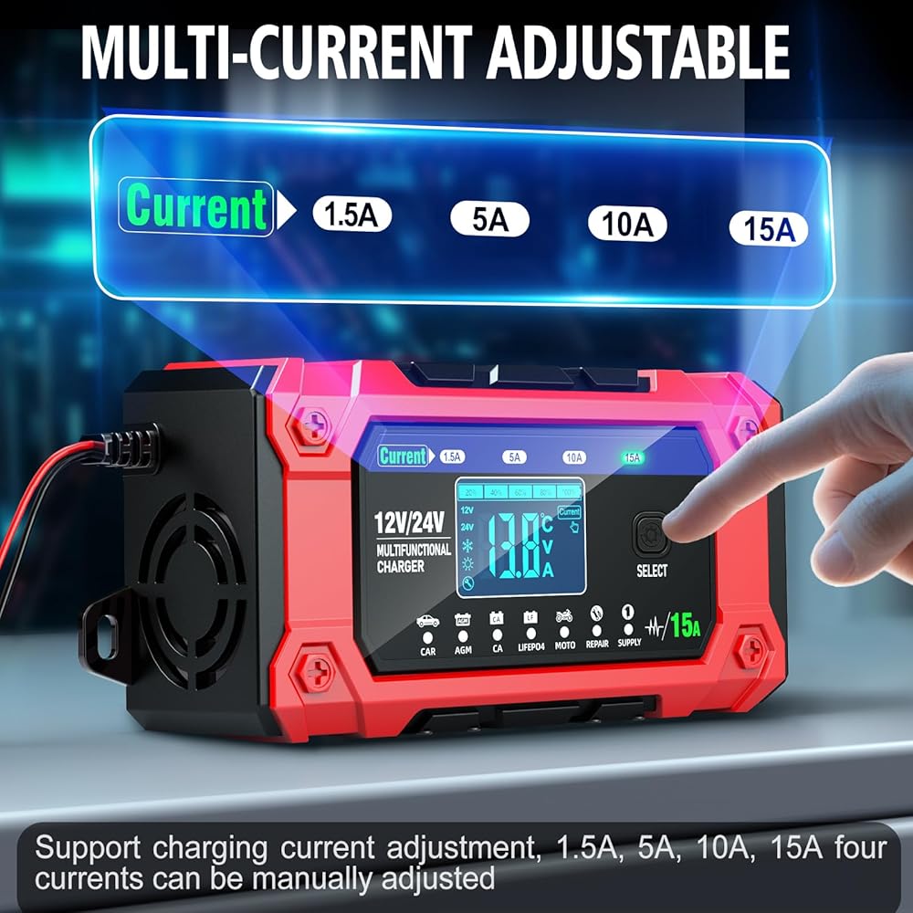 【شحن ذكي، مجموعة واسعة من التطبيقات】 شاحن بطارية ذكي أوتوماتيكي بالكامل 12 فولت 15 أمبير و24 فولت 5 أمبير مع وظائف قوية. إنه بمثابة حل الكل في واحد: الشاحن، والمحافظ، والشاحن المتقطر، ومزيل الكبريت. مناسبة لشحن وصيانة جميع بطاريات الرصاص الحمضية 12 فولت و24 فولت، بما في ذلك بطاريات AGM وGEL وSLA وLiFePO₄، للسيارات والشاحنات وسيارات الدفع الرباعي والدراجات النارية وجزازات العشب والقوارب والمزيد.