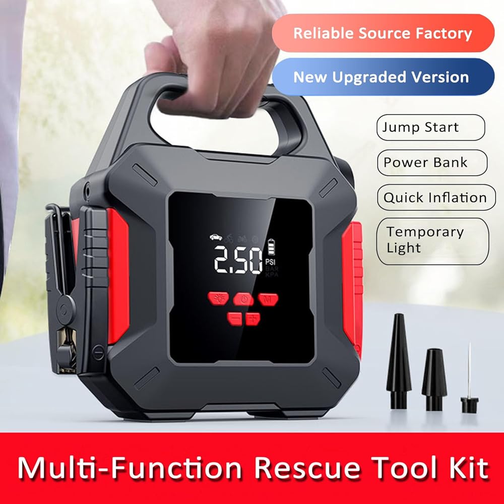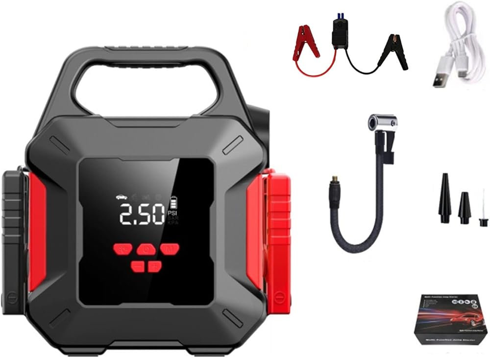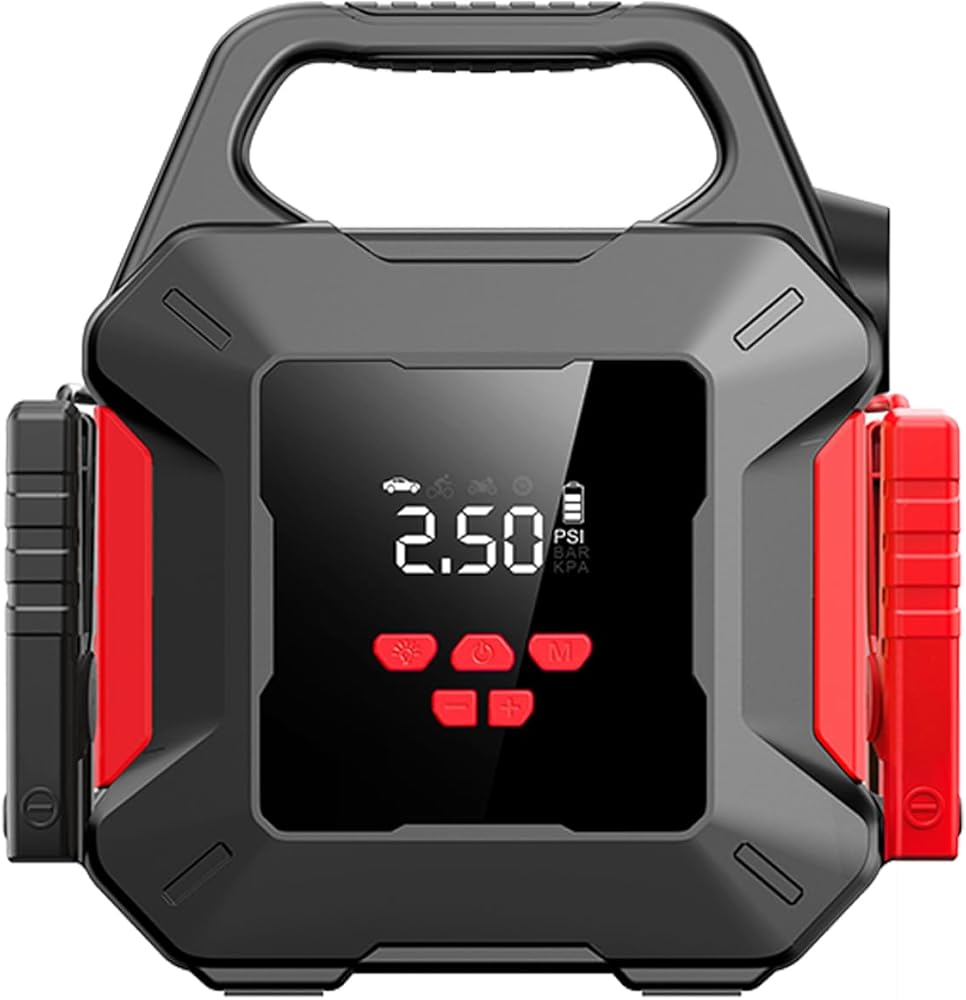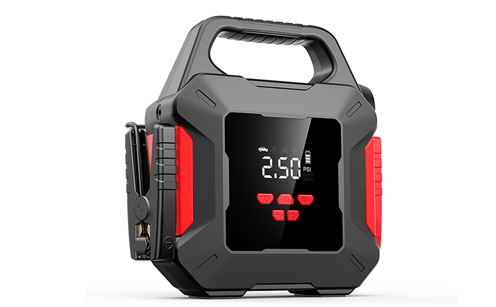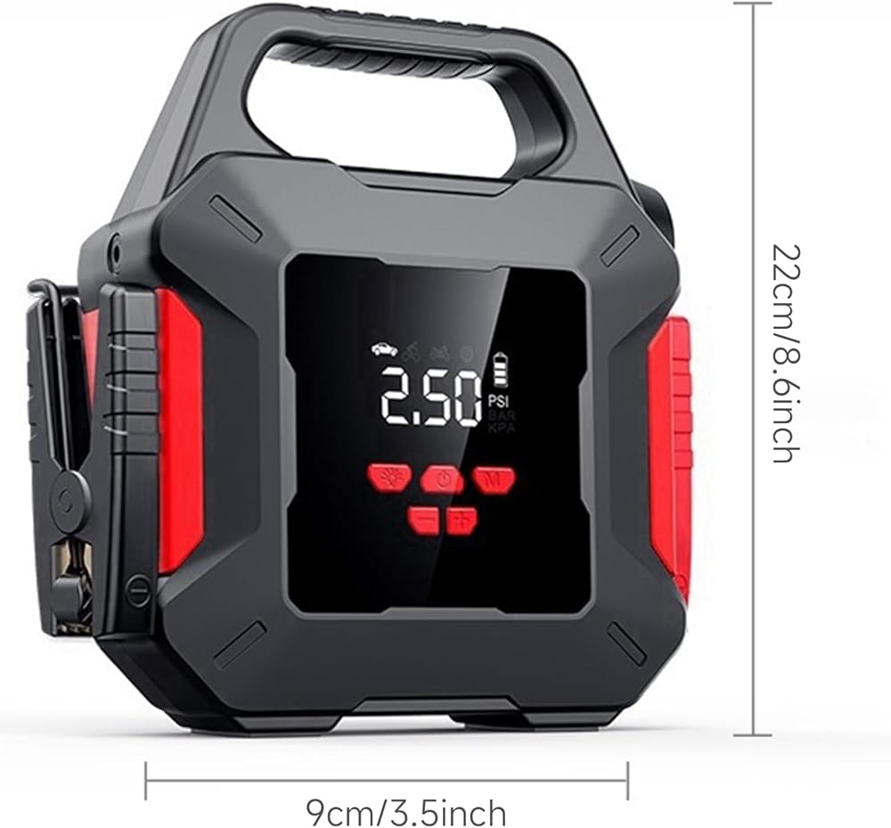 ميزة 6 في 1: مشغل قفز السيارة متعدد الوظائف الذي يضم مجموعة من بادئ القفز، وبنك الطاقة للشحن السريع، ومضخة التضخم، وإضاءة LED ومراقبة ضغط الإطارات. يتميز بشاشة LCD كبيرة الحجم تعرض بوضوح الطاقة المتبقية وحالة التشغيل بالضبط، مما يوفر رؤية فائقة مقارنة بأضواء المؤشر الأساسية.