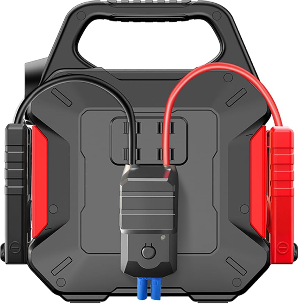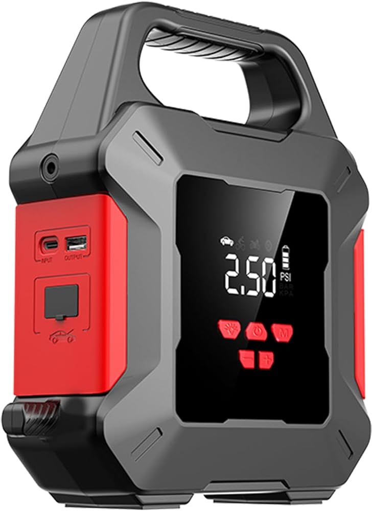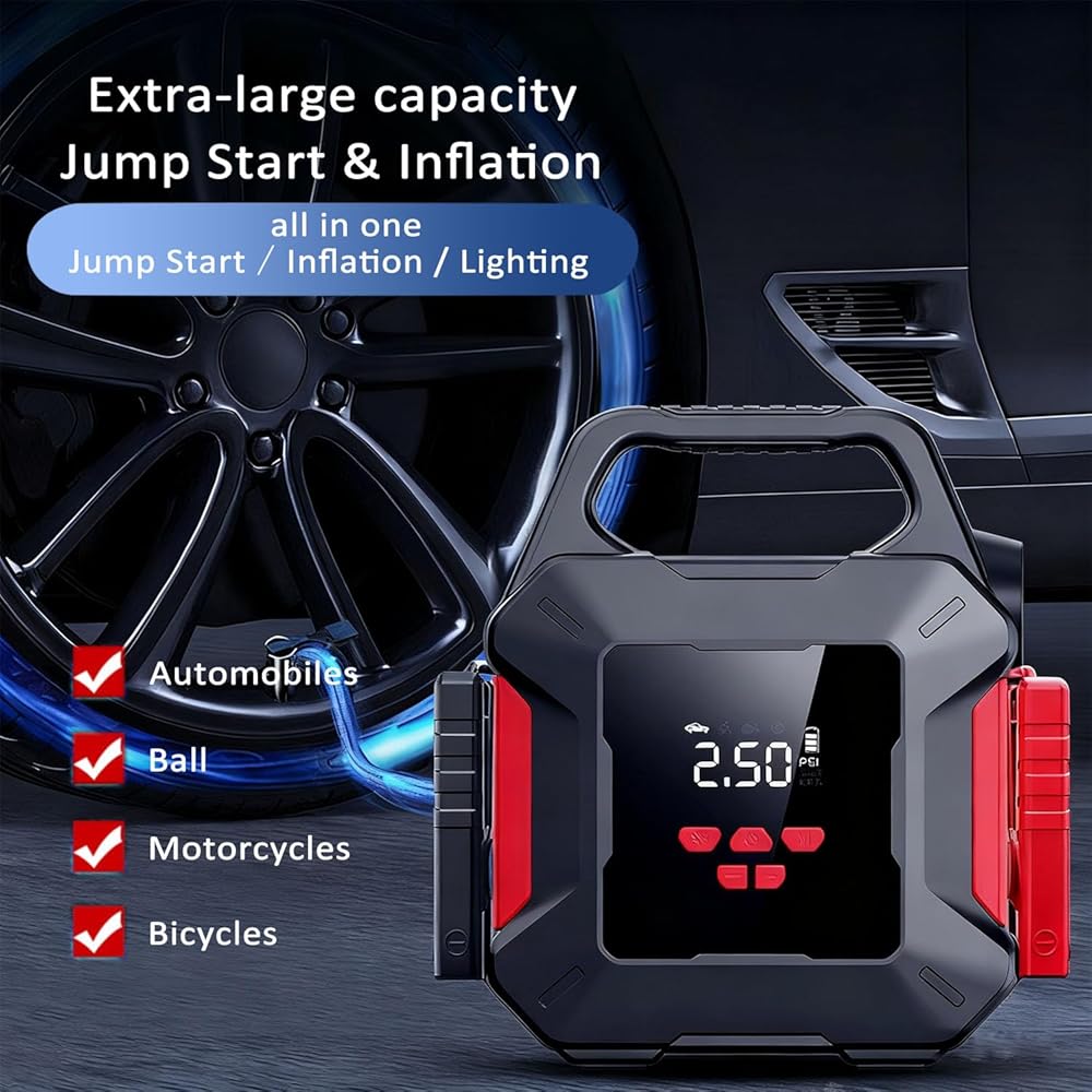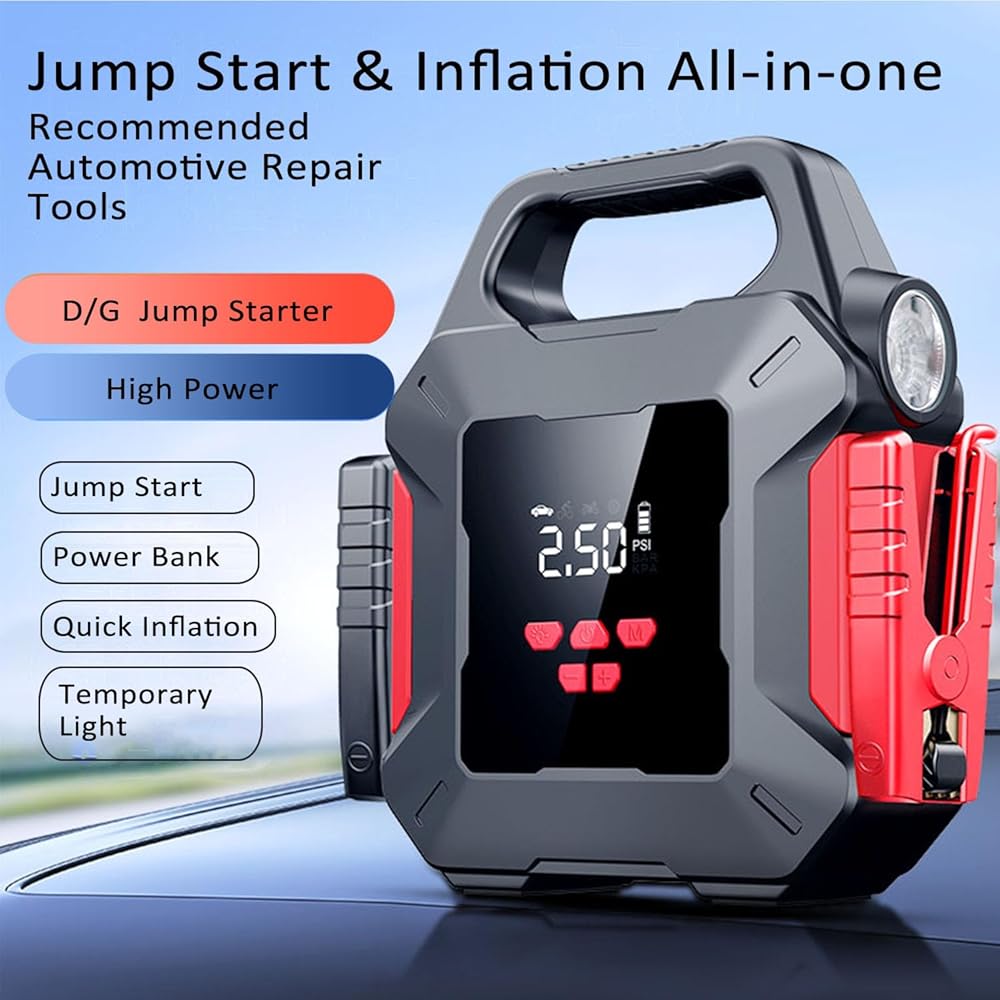 ميزة 6 في 1: مشغل قفز السيارة متعدد الوظائف الذي يضم مجموعة من بادئ القفز، وبنك الطاقة للشحن السريع، ومضخة التضخم، وإضاءة LED ومراقبة ضغط الإطارات. يتميز بشاشة LCD كبيرة الحجم تعرض بوضوح الطاقة المتبقية وحالة التشغيل بالضبط، مما يوفر رؤية فائقة مقارنة بأضواء المؤشر الأساسية.