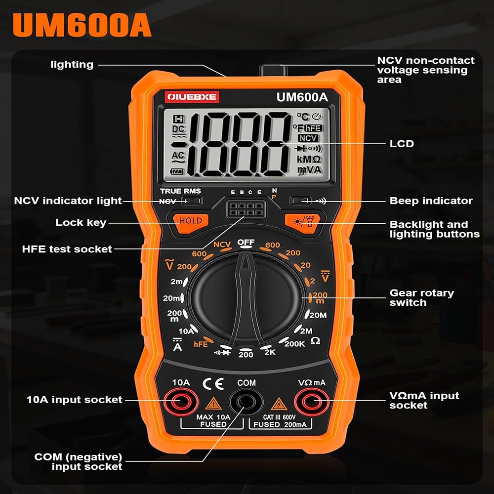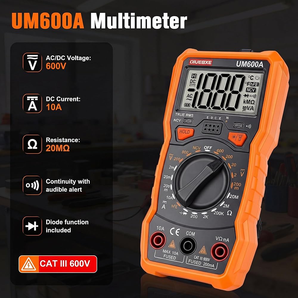 Digital Multimeter for Everyday Diagnostics – Test AC/DC Voltage (up to 600V), DC Current (10A), Resistance (20MΩ), plus Continuity and Diode checks. Backlit screen ensures clear readings even in low-light environments.