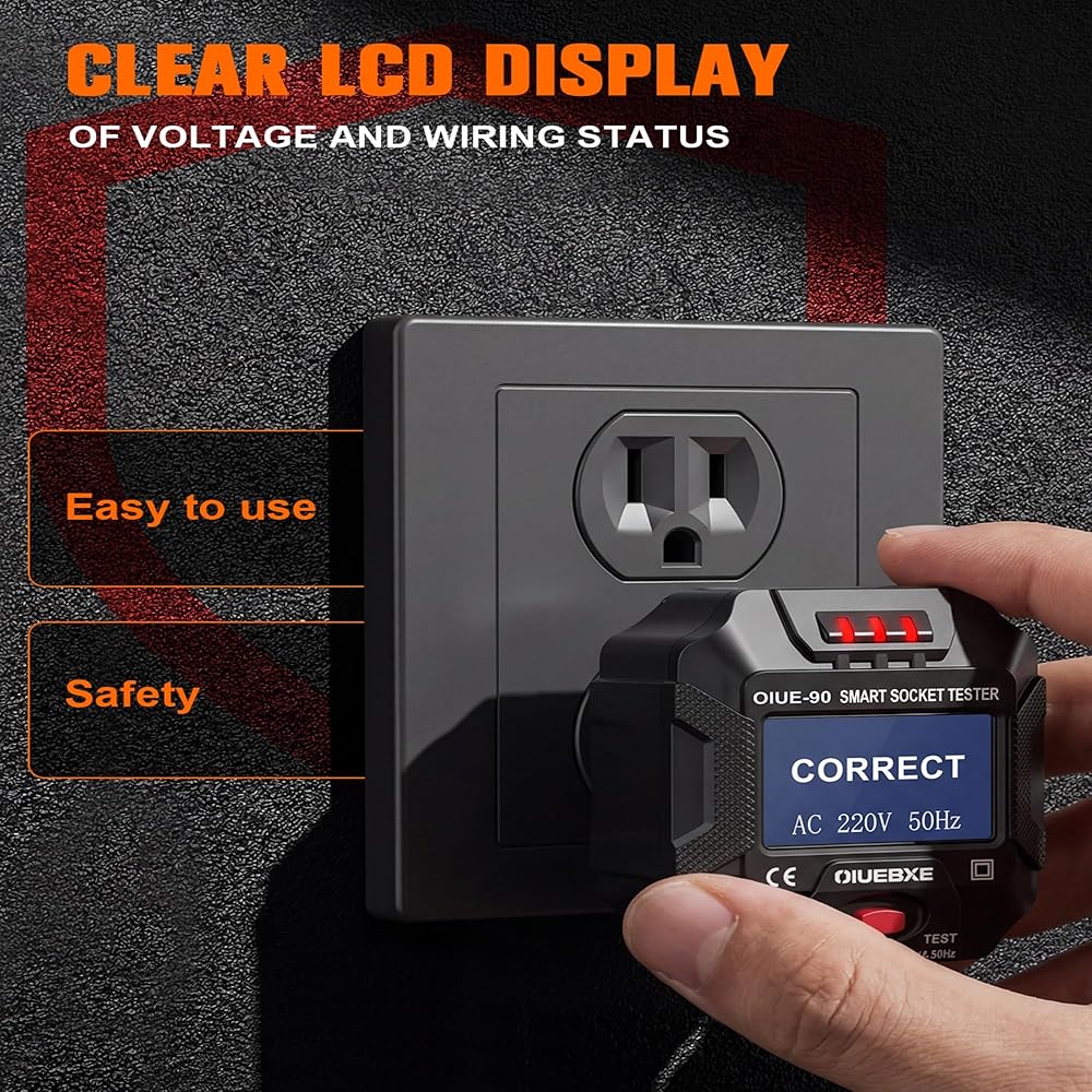 Quick Outlet Safety Check – The outlet tester instantly detects common wiring problems and verifies GFCI/RCD functionality. The LCD display shows real-time voltage and frequency readings for fast electrical safety checks.