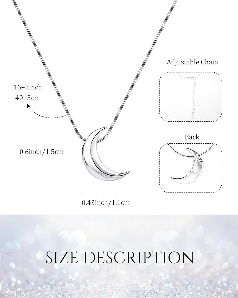 الحجم: يبلغ مقاس هذه القلادة المتدلية 16 بوصة مع تمديد 2 بوصة ويبلغ عرض الهلال 1.1 سم × ارتفاع 1.5 سم - حجم قلادة فضية أنيقة رقيقة ولكنها معبرة