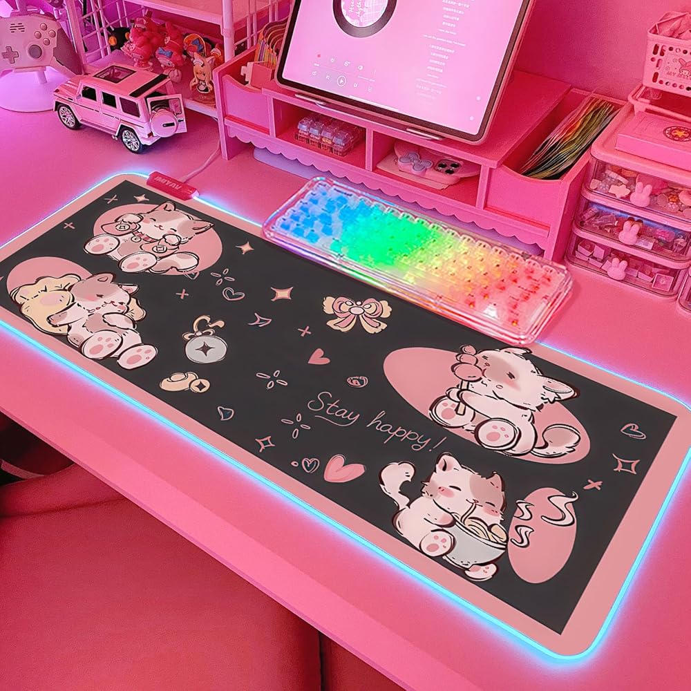 لوحة ماوس ألعاب JMIYAV باللون الوردي RGB مقاس 31.5 × 12 بوصة PC XL كبيرة ممتدة متوهجة بإضاءة LED وسادة مكتب قاعدة مطاطية غير قابلة للانزلاق للكمبيوتر لوحة ماوس لطيفة ملحقات مكتبية إعداد الألعاب 2-7-1030-2