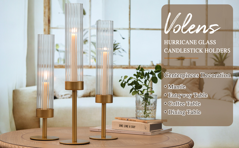 【ELEGANT TABLE CENTERPIECE】Volens Hurricane Glass Candle Holder is defined by restraint and refinement. قاعدة معدنية صلبة ترتكز على القطعة، بينما يلتقط غطاء الأسطوانة الزجاجية اللامعة ضوء الشموع بلطف ويضخمه، مما يخلق توهجًا يشعرك بالدفء والثبات والمتعمد. Perfectly scaled for dinner settings, side tables, mantle, and cozy corners.