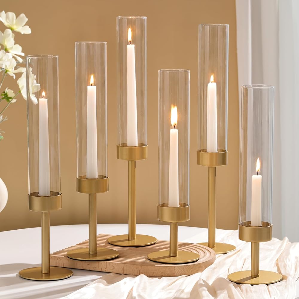 【حاملات شموع مقاومة للرياح】مجموعة من 6 حوامل شموع تتضمن 3 قواعد معدنية متنوعة: 3.93 بوصة/5.91 بوصة/7.87 بوصة (ارتفاع)، قطر كل فتحة شمعة 0.87 بوصة، تناسب استخدامها مع أي شموع مستدقة مقاس 0.87 بوصة، أو شموع عديمة اللهب، أو شموع LED. يحمي الإعصار الزجاجي اللهب من الرياح، مما يجعله مثاليًا لكليهما. indoor and outdoor use. Different-sized candle holders added height and rich visual effects to larger spaces and longer gatherings.