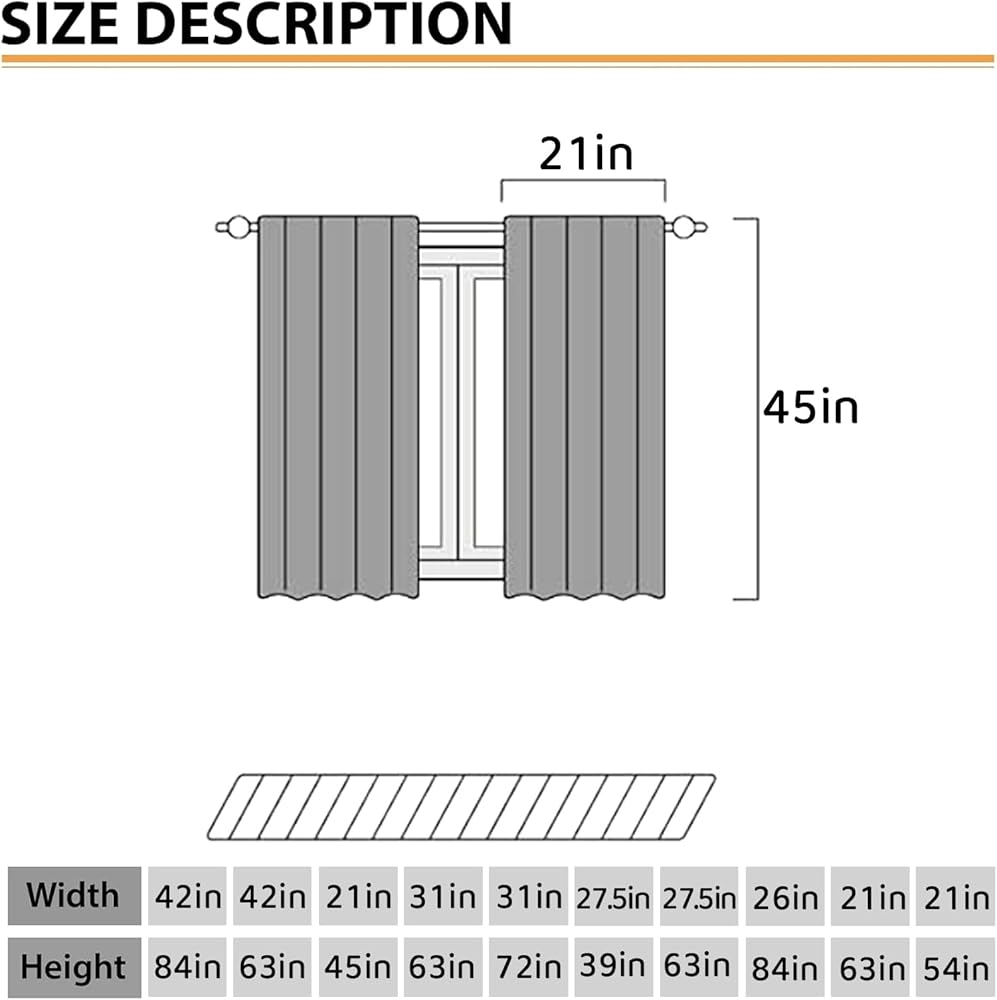 Curtain Size:Includes 2 curtain panels,each measuring 21"W x 45"L,combined is 42"W x 45"L inches,Please buy according to your needs