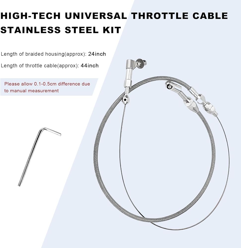 Product Specification: The length of our throttle cable is 44", and the braided sheath length is 24". The connector attached to the valve is 0.5" long, and the connector attached to the throttle pedal is 1.0" long. To ensure proper fit, please check the product information before purchasing