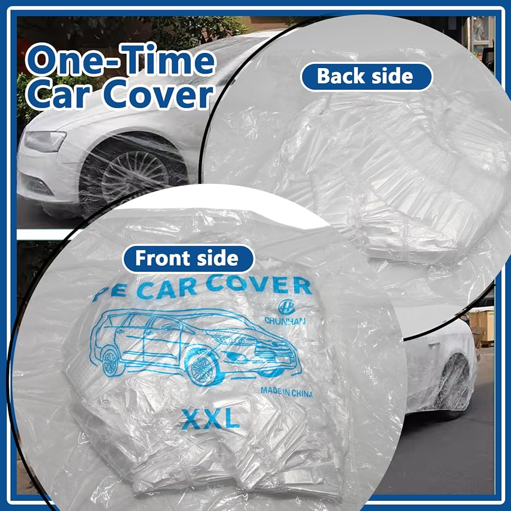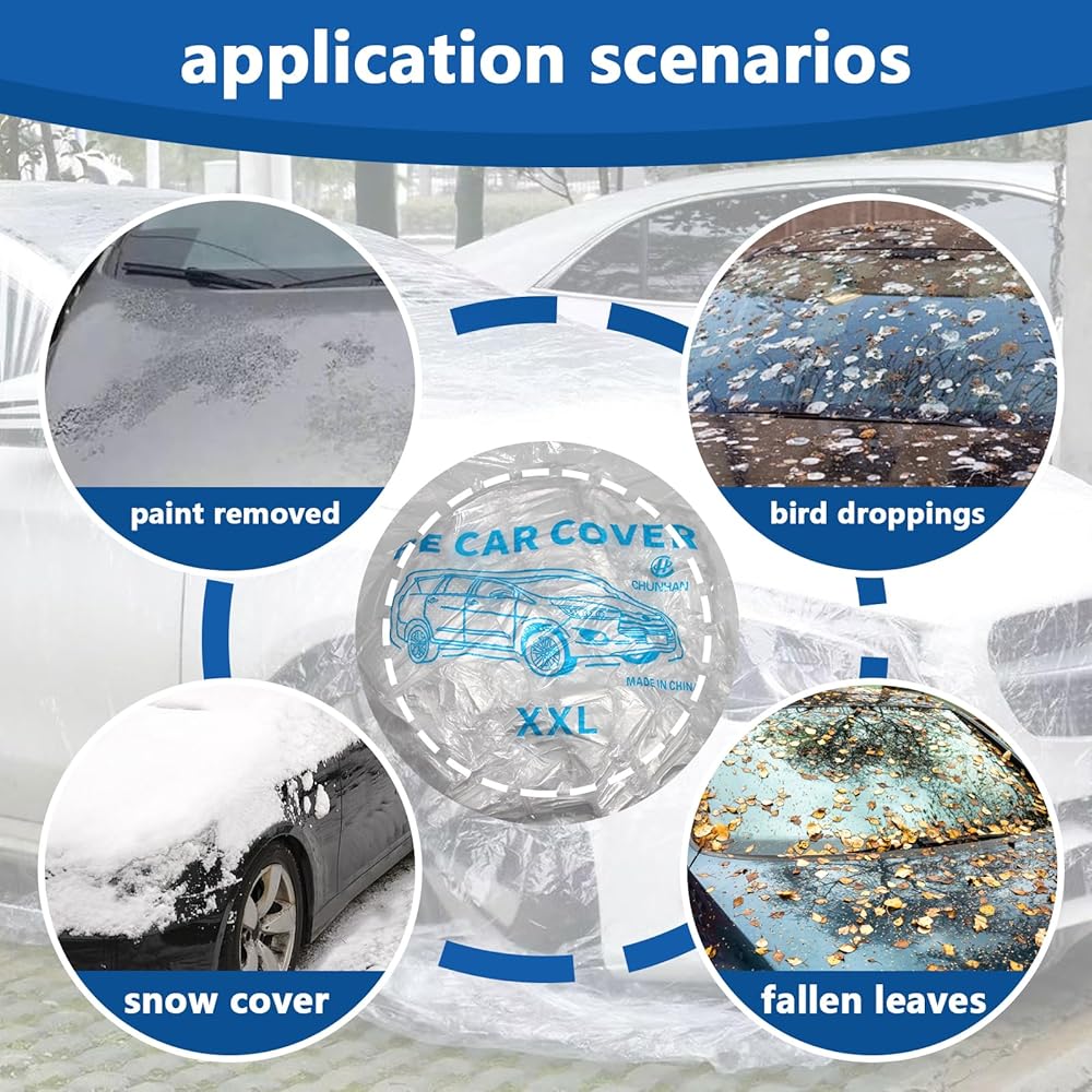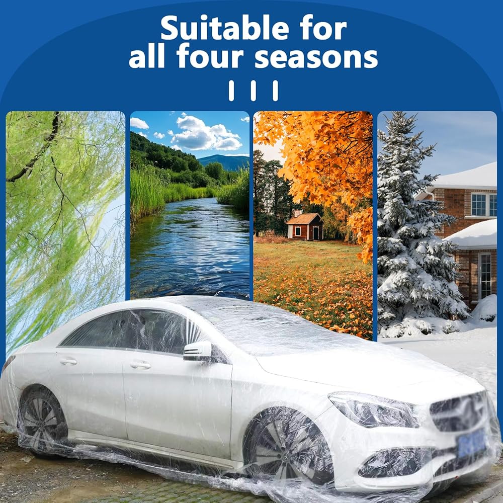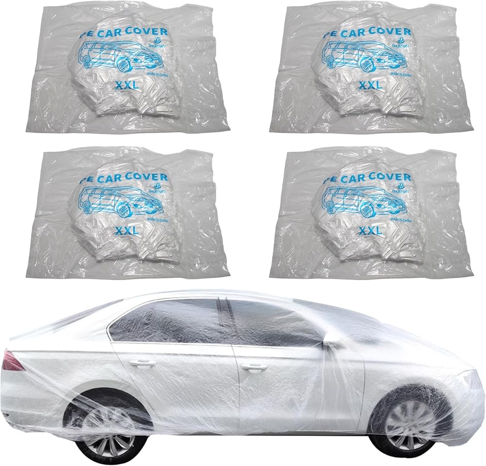 4 عبوات من أغطية السيارات الشفافة للاستعمال مرة واحدة، أغطية حماية بلاستيكية متوسطة الحجم للمركبات مع شريط مطاطي، مناسبة عالميًا لتخزين غبار المطر في الأماكن المغلقة والخارجية