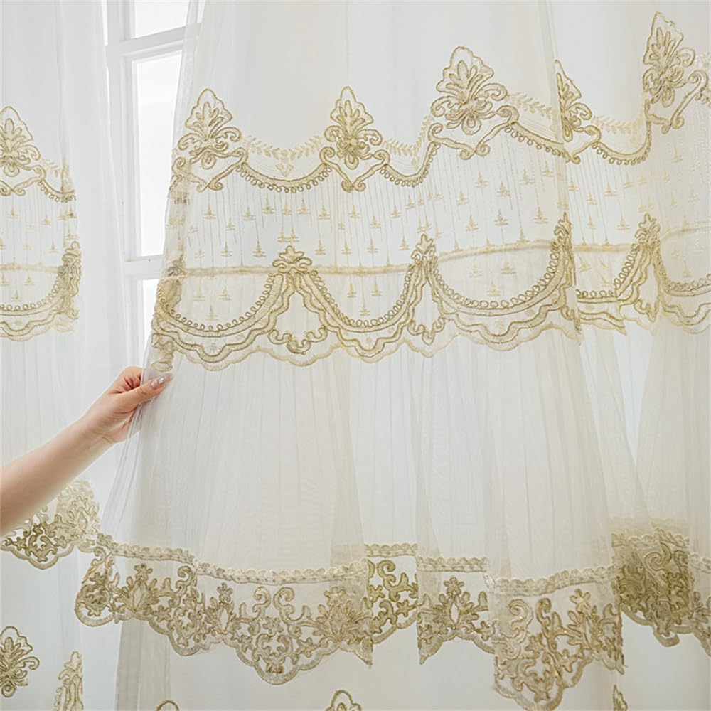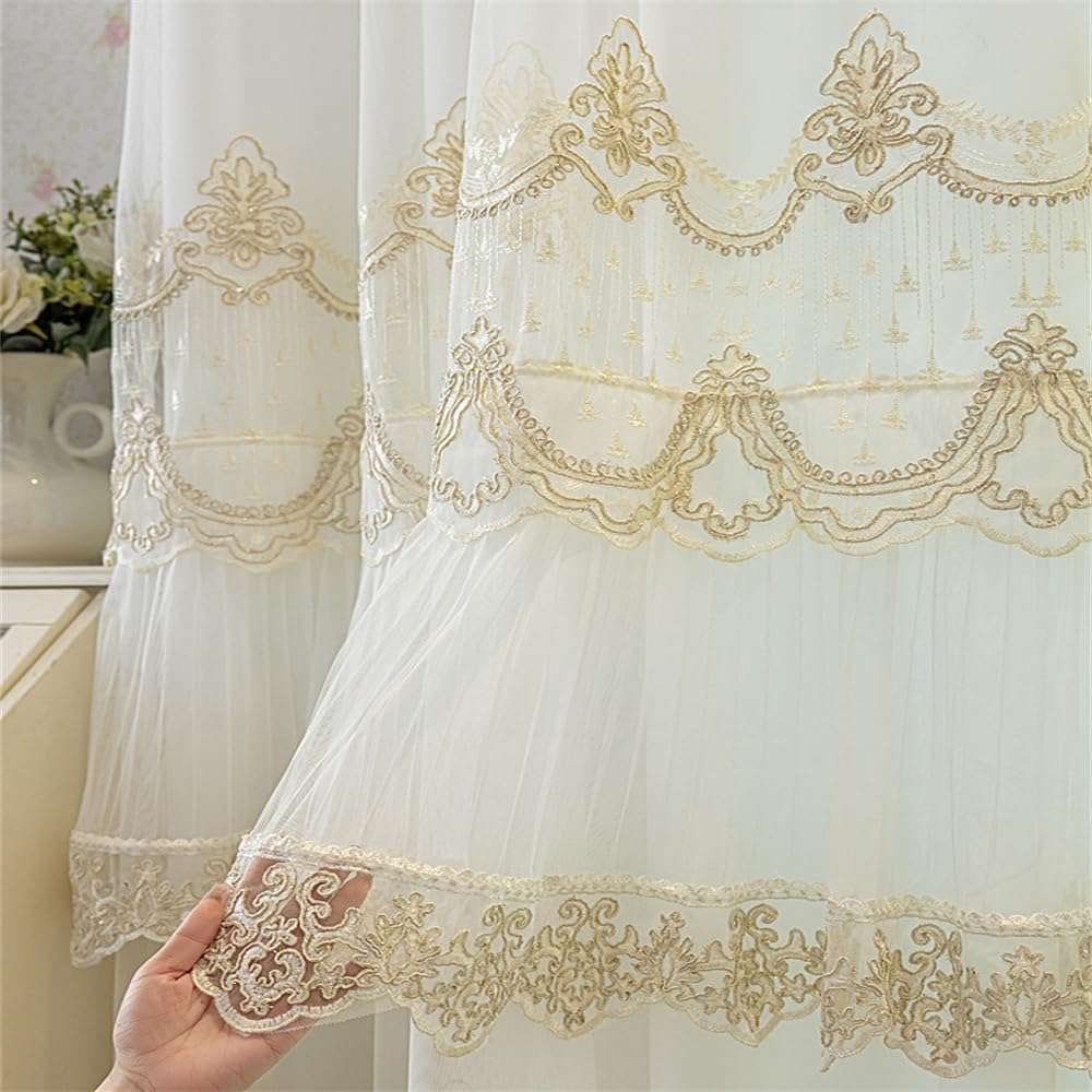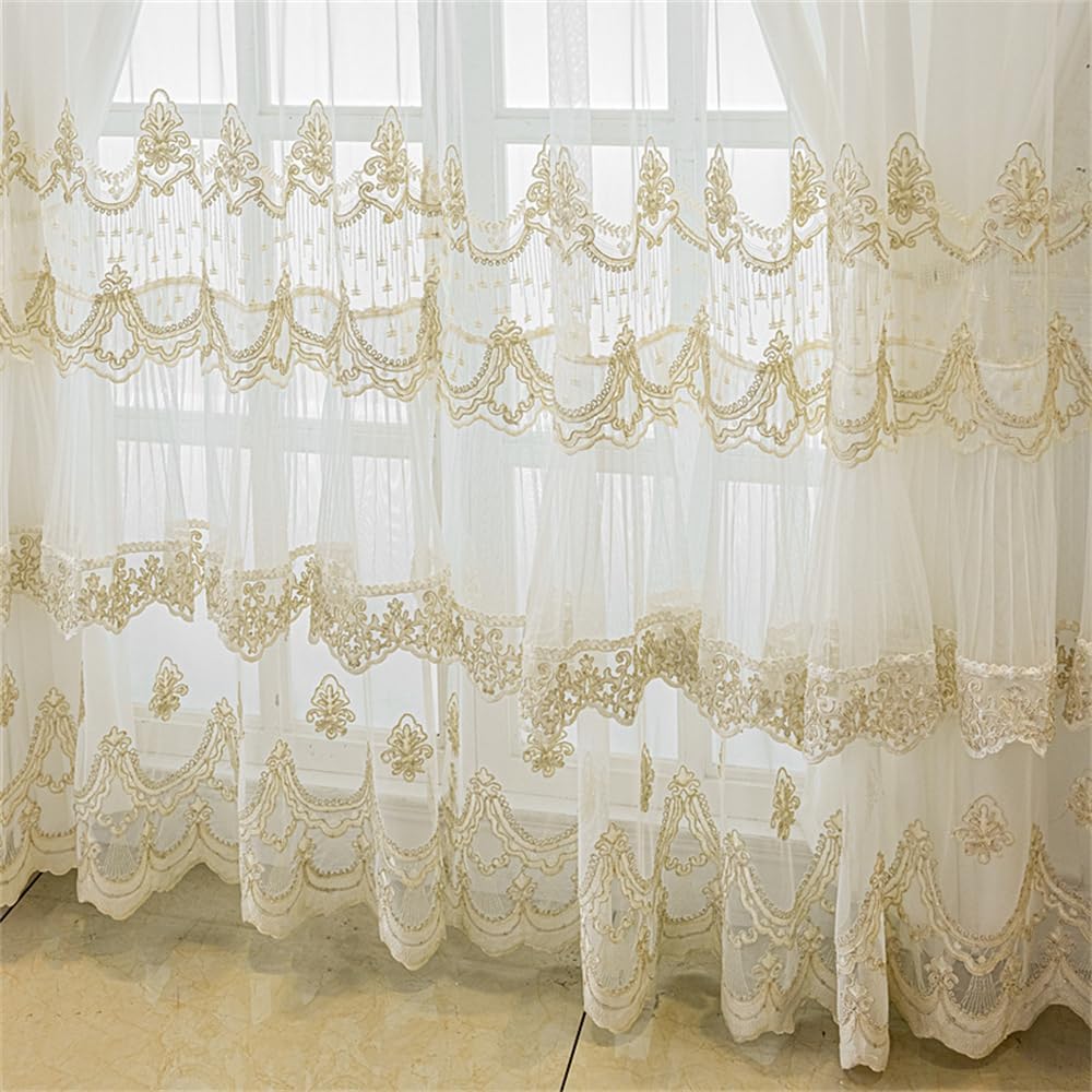 Package: 1 Panel double layer sheer curtain, top with attached lace valance. (1 panel beige 3D beaded embroidery sheer + 1 panel white translucent sheer + 1 Panel attached lace valance, stitch together on the top, non-removable).