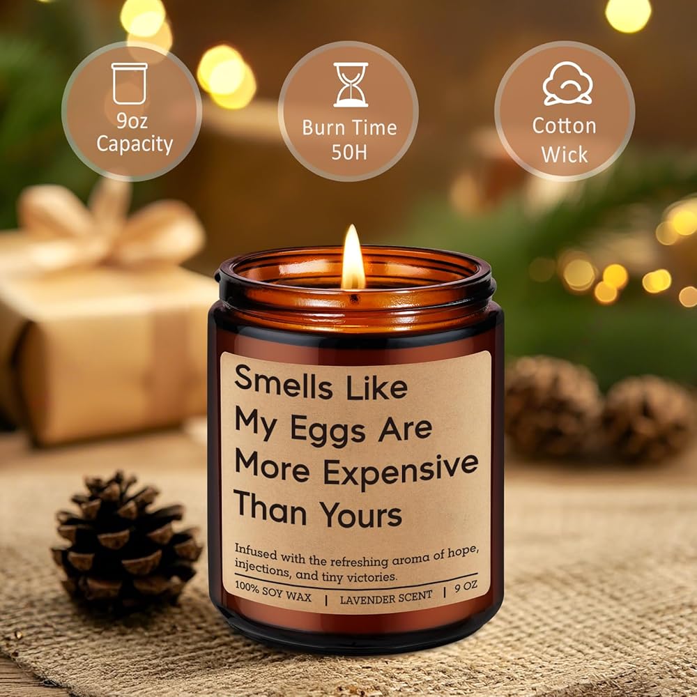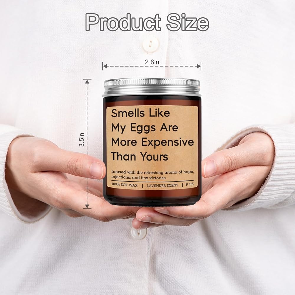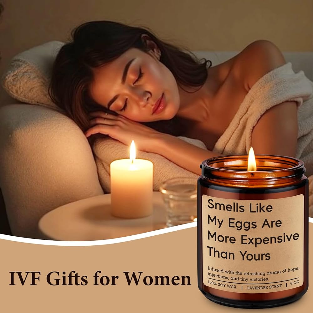 هدايا التلقيح الاصطناعي للنساء. تتميز الشمعة المعطرة برسالة فكاهية "رائحة مثل بيضتي أغلى من رائحة بيضك"، وهي هدية مضحكة ومدروسة لأي شخص يخضع للتخصيب في المختبر (IVF) ويحاول الحمل؛ سواء كان ذلك لعائلتك أو صديقك أو زميلك في العمل أو أي شخص يعاني من إنجاب طفل، فإن شمعة IVF هذه هي رمز صادق لدعم الخصوبة.