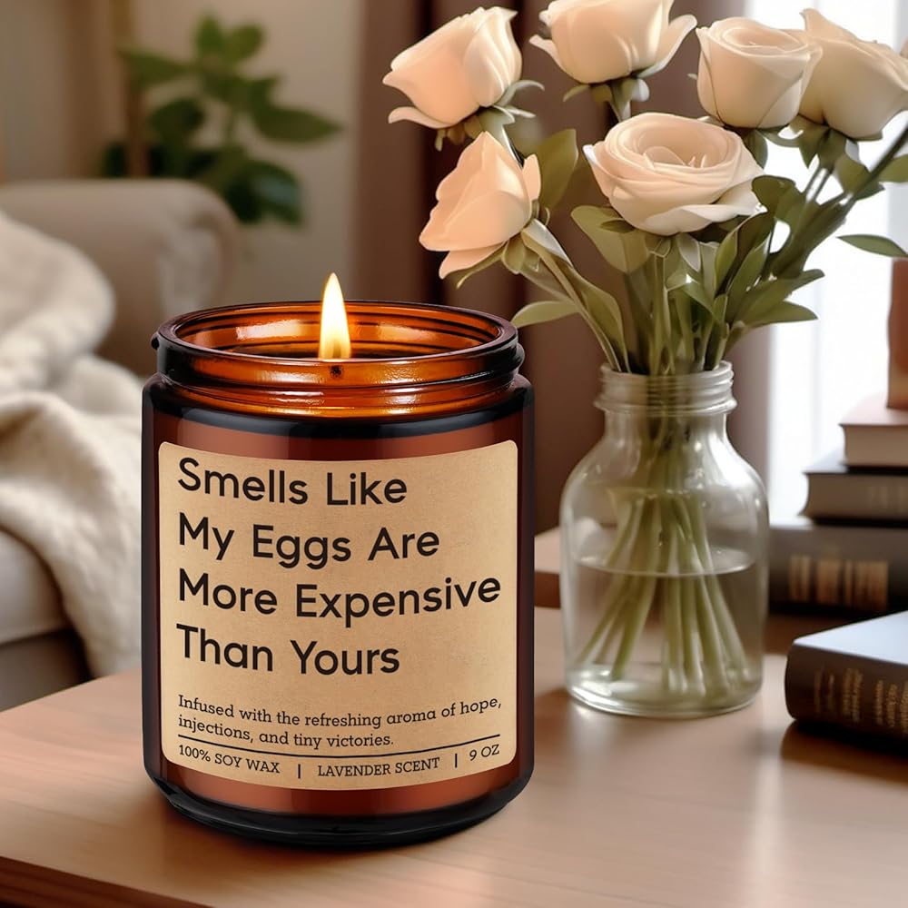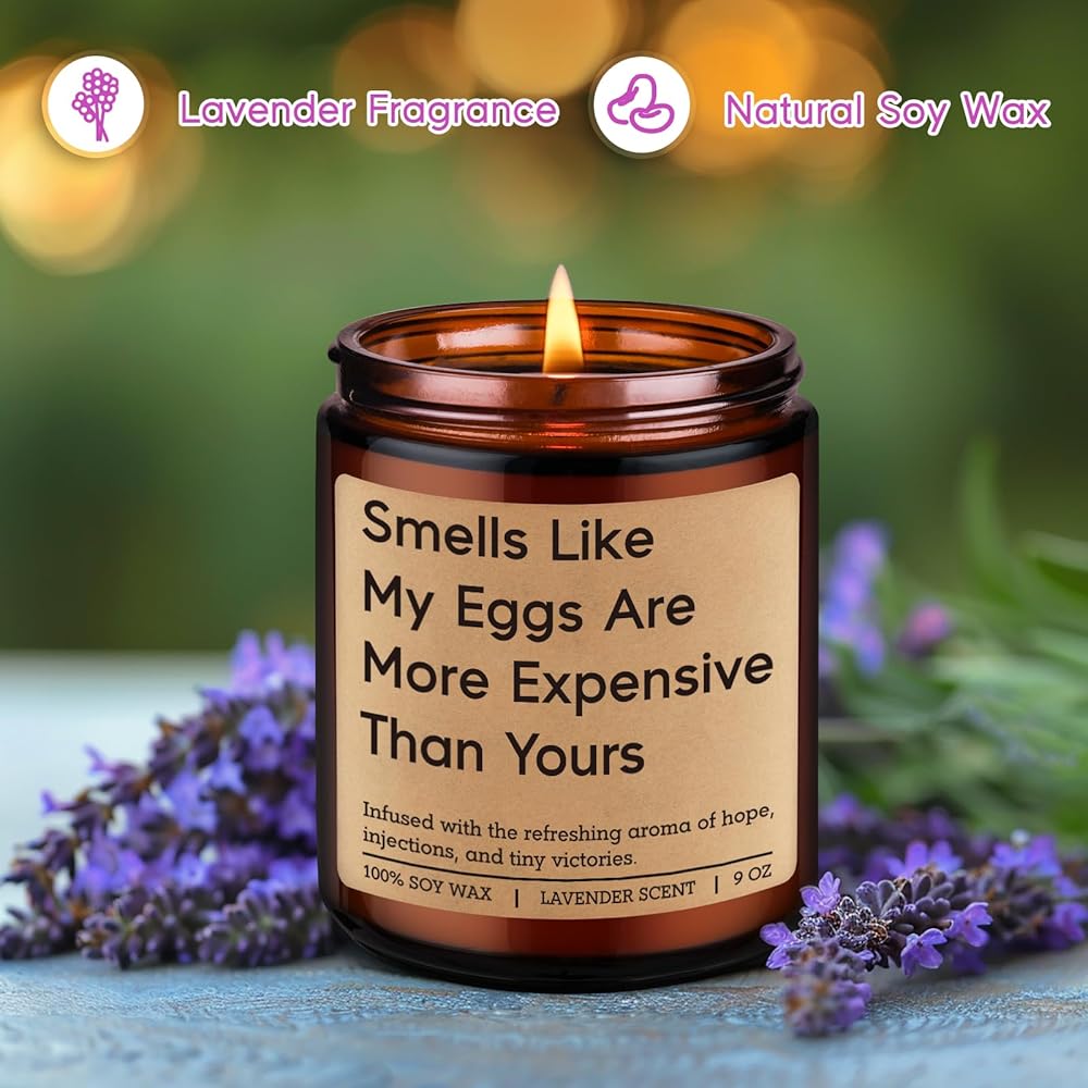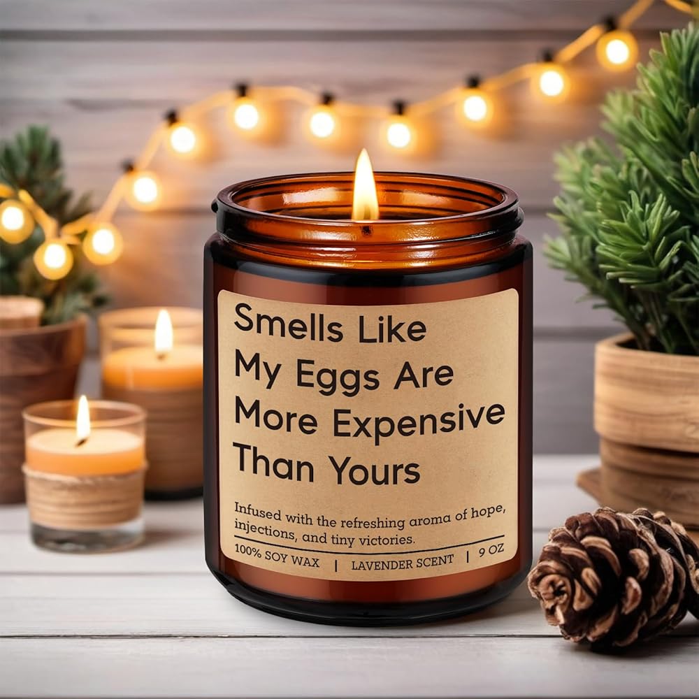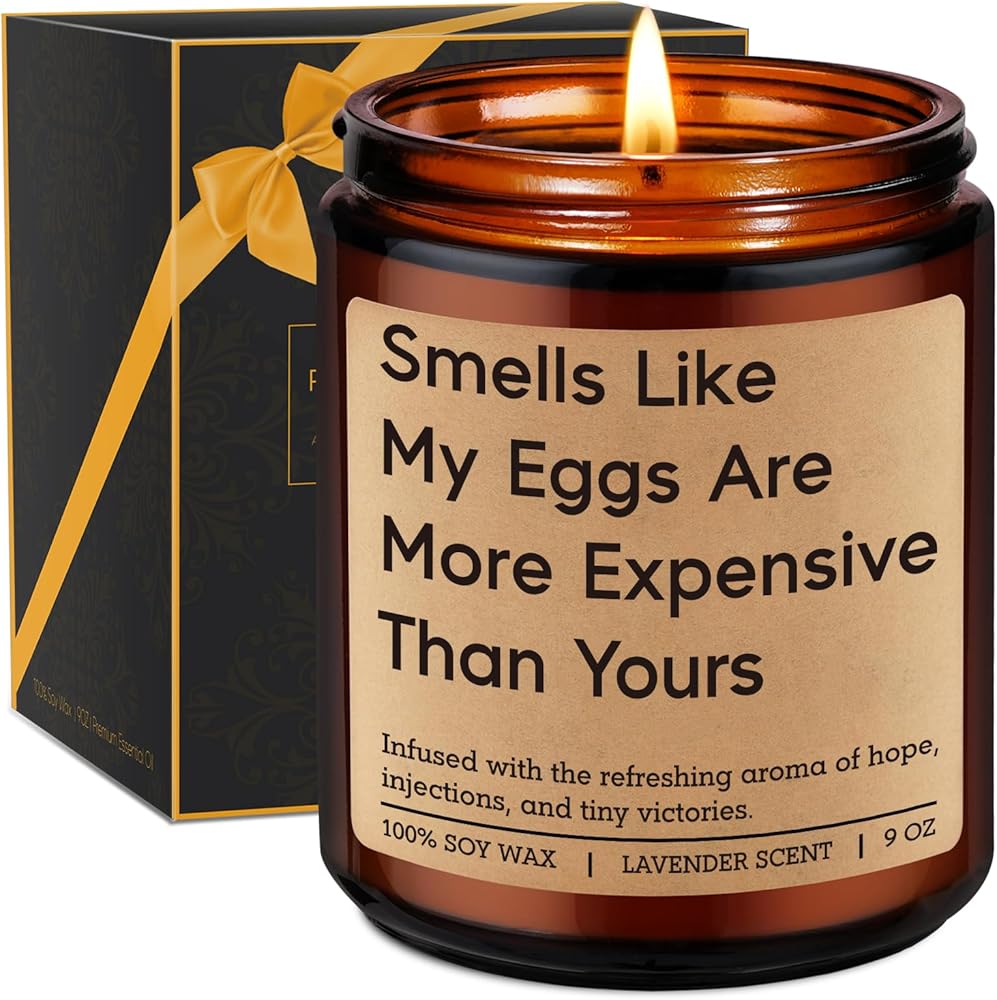 هدايا التلقيح الاصطناعي للنساء. تتميز الشمعة المعطرة برسالة فكاهية "رائحة مثل بيضتي أغلى من رائحة بيضك"، وهي هدية مضحكة ومدروسة لأي شخص يخضع للتخصيب في المختبر (IVF) ويحاول الحمل؛ سواء كان ذلك لعائلتك أو صديقك أو زميلك في العمل أو أي شخص يعاني من إنجاب طفل، فإن شمعة IVF هذه هي رمز صادق لدعم الخصوبة.