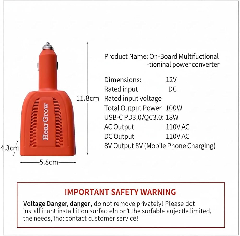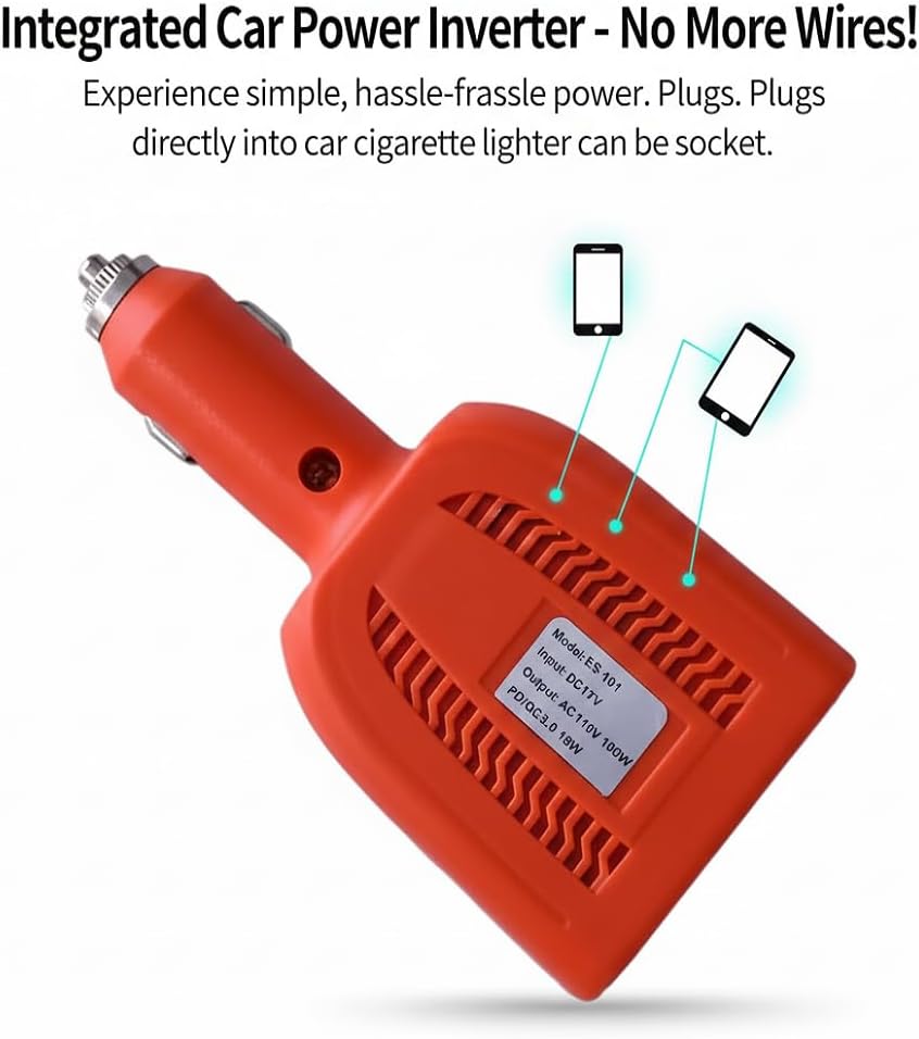 مخرج تيار متردد قوي 100 وات: يحول طاقة تيار مستمر 12 فولت إلى 110 فولت تيار متردد بكفاءة، مما يوفر مصدر طاقة موثوقًا لشحن أجهزة الكمبيوتر المحمولة والأجهزة اللوحية والأجهزة الإلكترونية الصغيرة أثناء السير على الطريق.