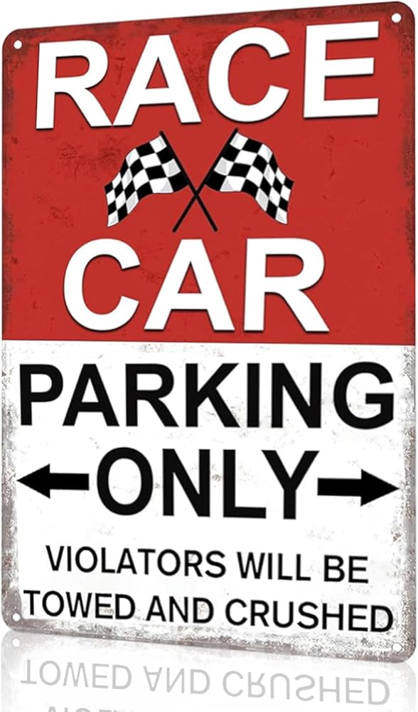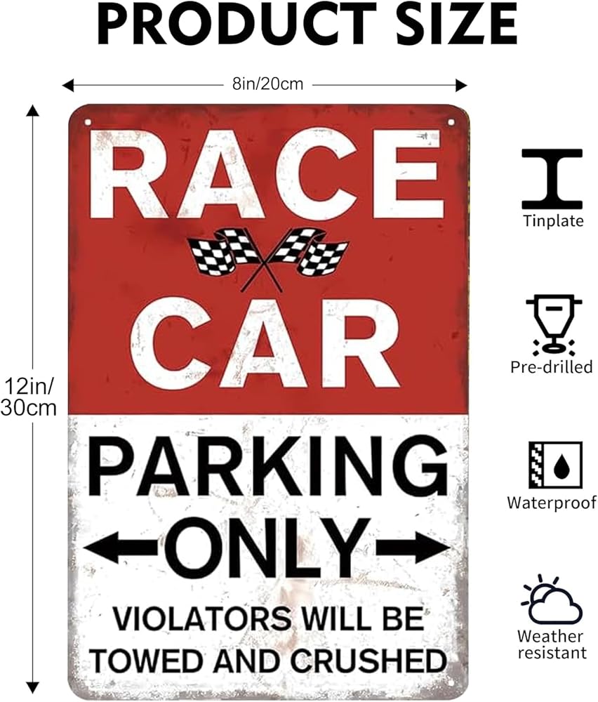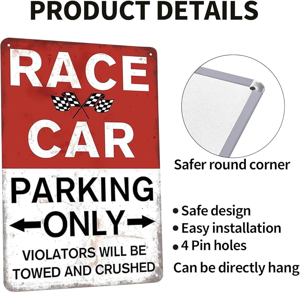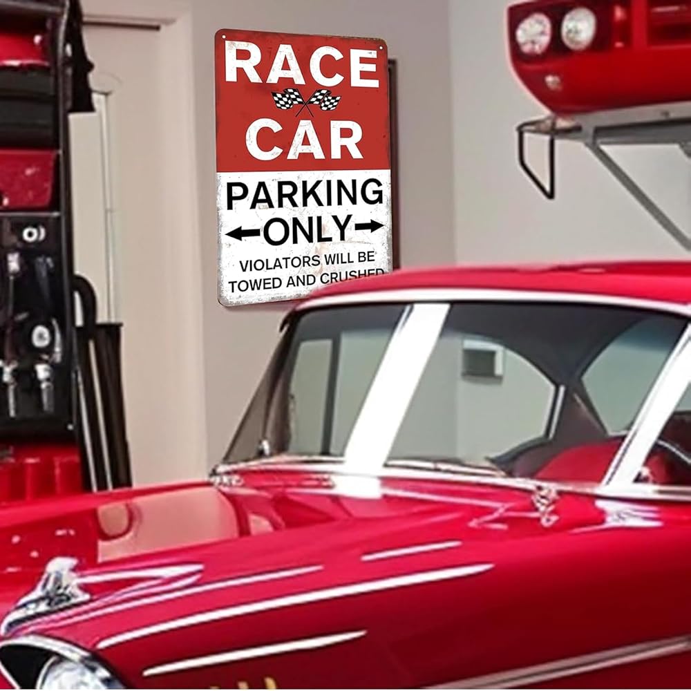 "Vintage Race Car Wall Decor - Ultimate Motorsport Decor for Boys' Rooms & Man Caves Transform any space into a speed lover's paradise with our 8x12 Inch Tin Metal Race Car Parking Sign! Designed for car-themed bedrooms, garages, and man caves, this durable distressed tin decor combines racing vibes with rugged functionality. Featuring ""Race Car Parking Only"" lettering and a weather-resistant coating, it withstands indoor adventures and covered outdoor use—perfect for car enthusiasts or nostalgic dads. Easy to install with pre-drilled holes, this vintage wall art instantly elevates spaces alongside model cars and checkered flags. Crafted from heavy-duty tin metal (not flimsy plastic!), its authentic rustic texture sparks imagination while surviving rowdy playrooms. as a birthday gift for boys or Father's Day surprise, it arrives gift-ready to deliver that ""Wow, just like a real racetrack!"" moment. Compact yet eye-catching, it's the #1 choice for motorsport decor that grows with your child—from toddler racecar themes to teenage garage makeovers. Rev up your decor game today!"