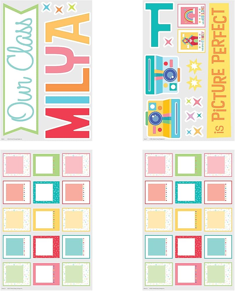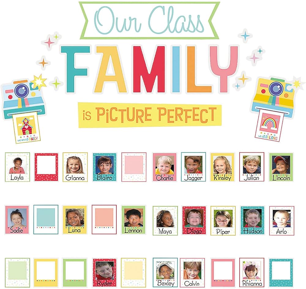 Show everyone that they're part of your classroom family with an inclusive classroom decoration that features photo frames in which you can hang pictures of your students. This wall or door decoration inspires kindness and helps students learn each other's names. Cardstock. Includes 4 sheets of cutouts. Includes 30 frames, 4" x 4 3/4" with a 3" x 3" photo space. (51 pcs. per unit) Sheets, 16" x 24 1/2".