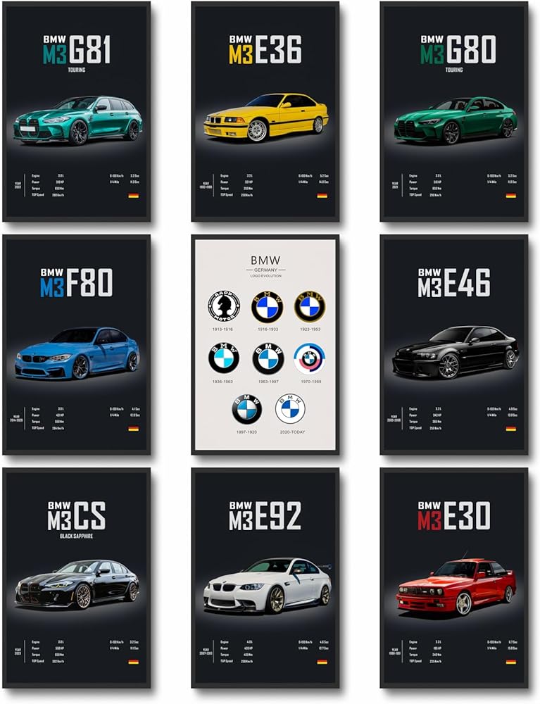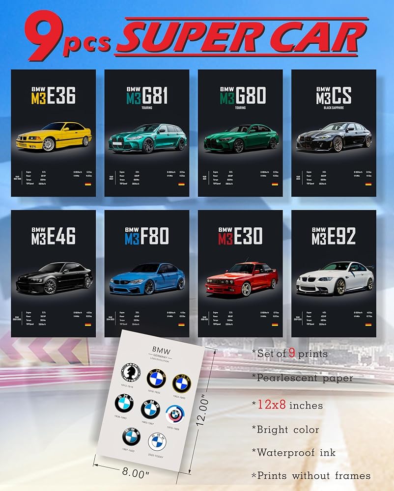 9pcs Super Car Posters for Boys Room, Racing Car Wall Art for Men Guys, Sports Car Wall Decor, Race Cars Pictures Wall Decor for Bedroom Dorm Man Cave (Unframe,8x12inch)