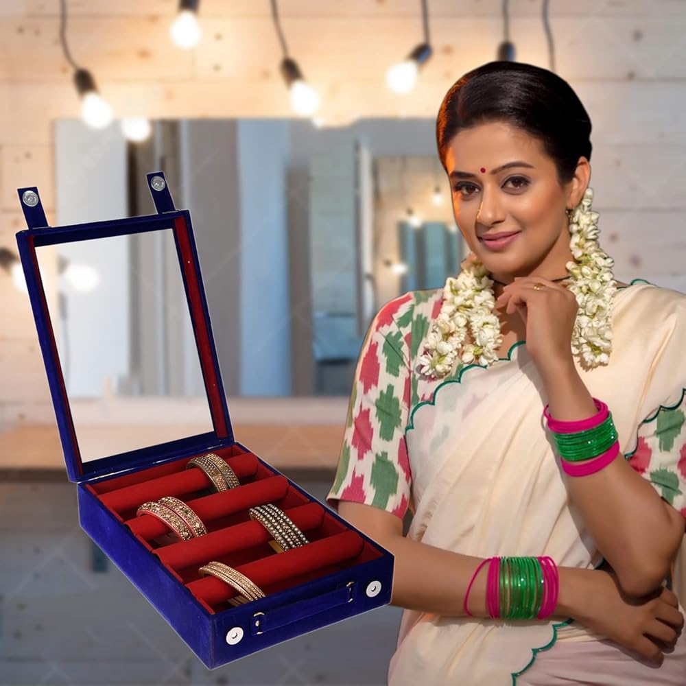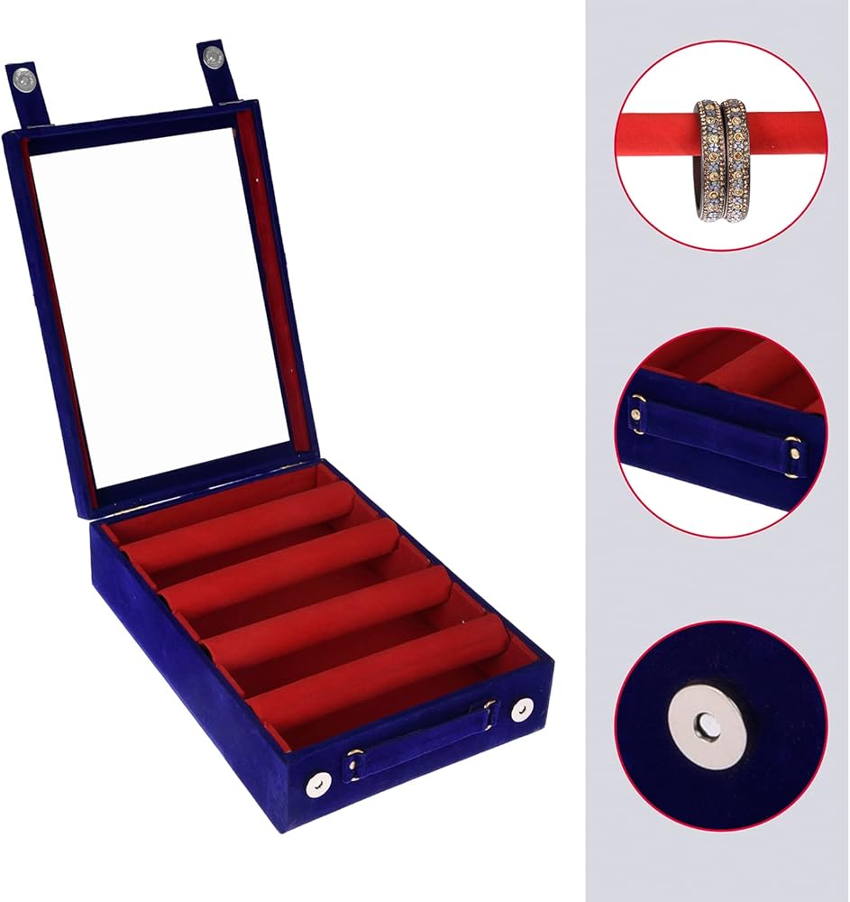 • 🍂 VELVET COATED WOODEN CRAFT: This Premium Bangle Box gives a premium and unique feel while keeping all your valuables at one place. Made from eco-velvet and MDF, the inside of the box is velvet lined to keep all your bangles safe. This bangle box is going to keep your bangles safe. This bangle box is covered with special velvet.